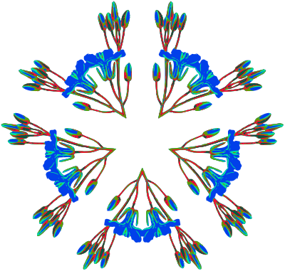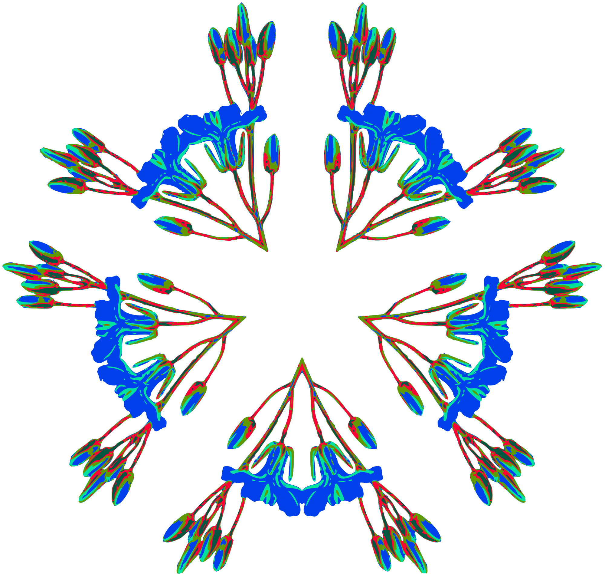 Design with approximate rotational symmetry formed from elements of a plant drawing.
