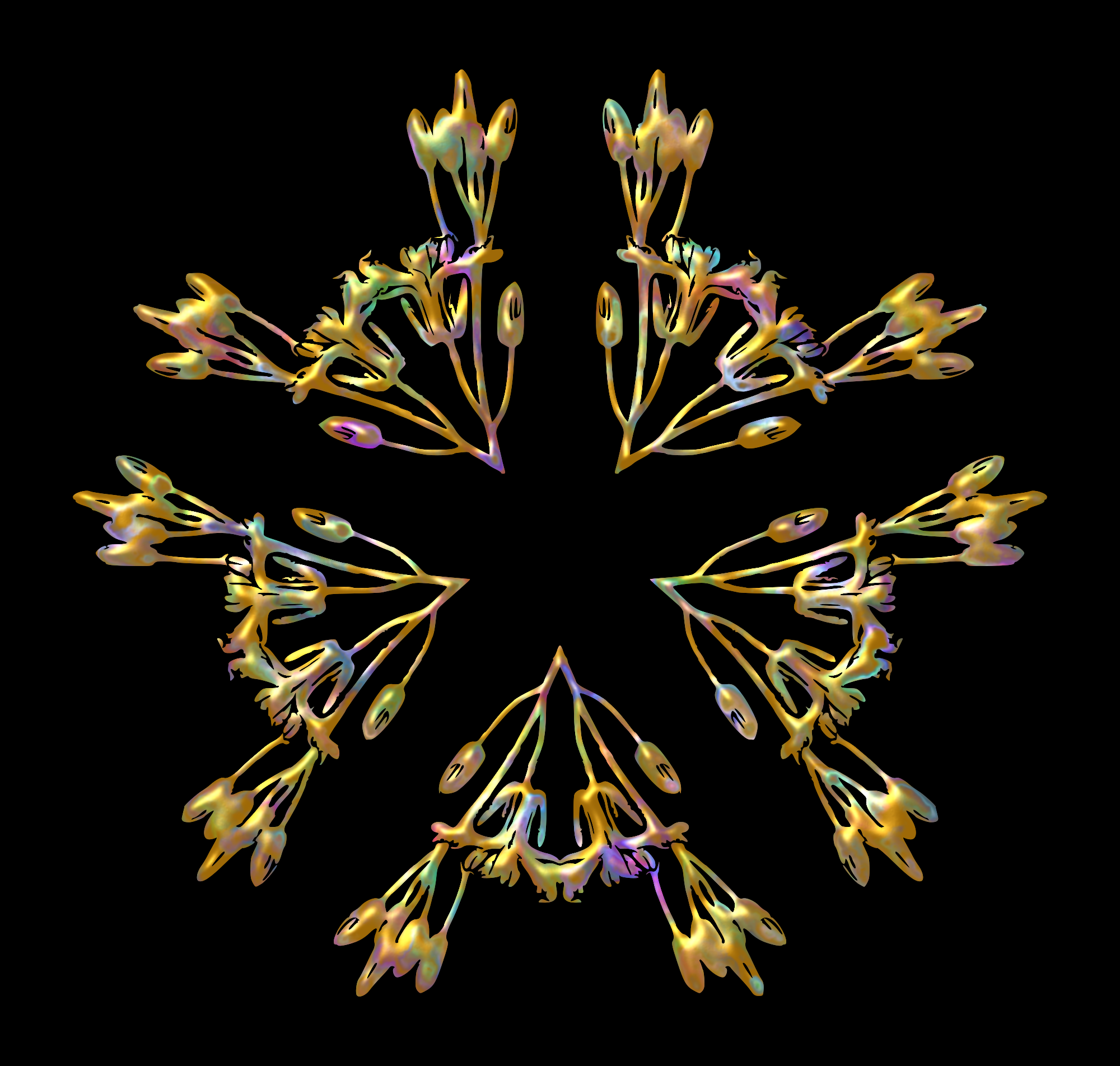 Design with approximate rotational symmetry formed from elements of a plant drawing.
