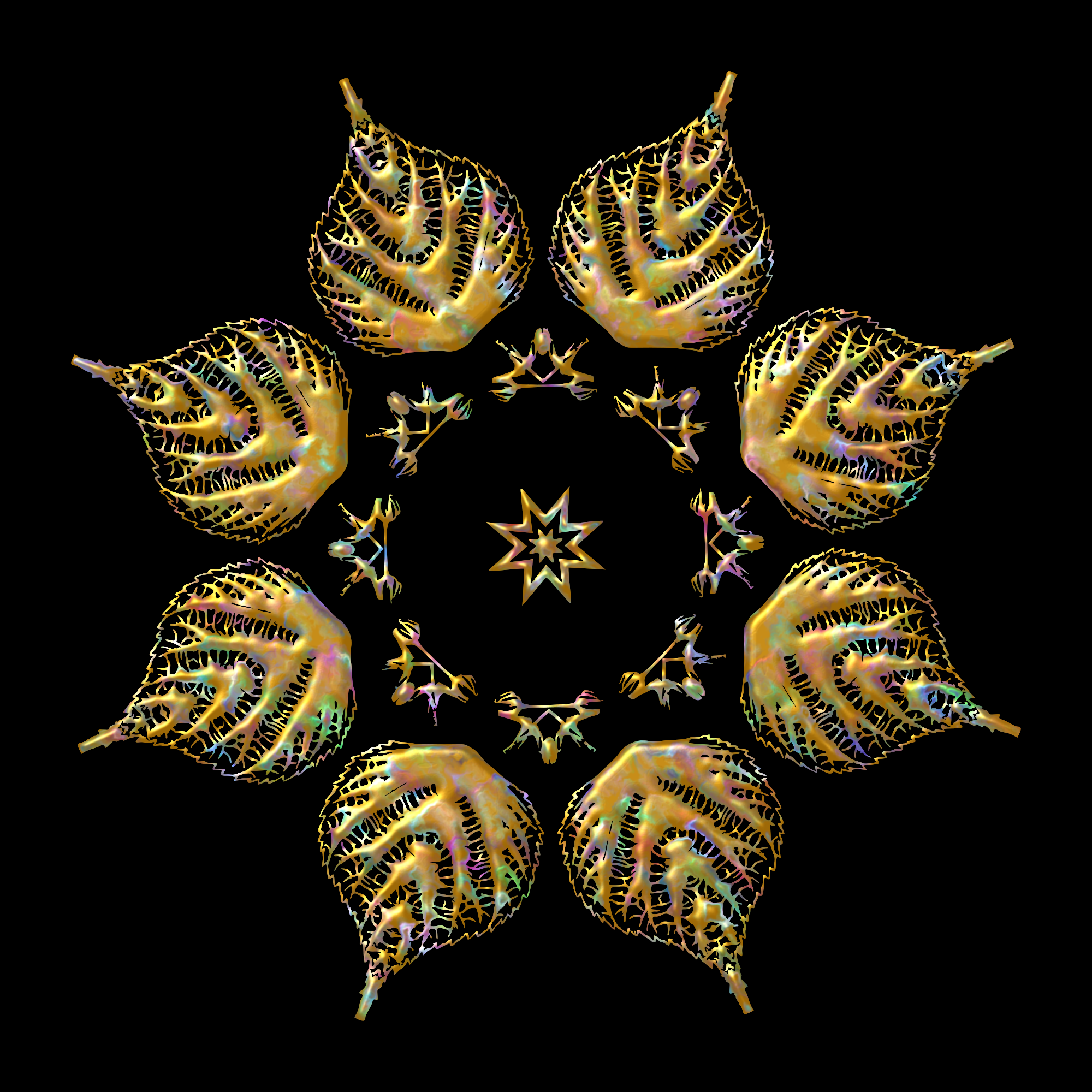 Design with rotational symmetry formed from elements of a plant drawing.