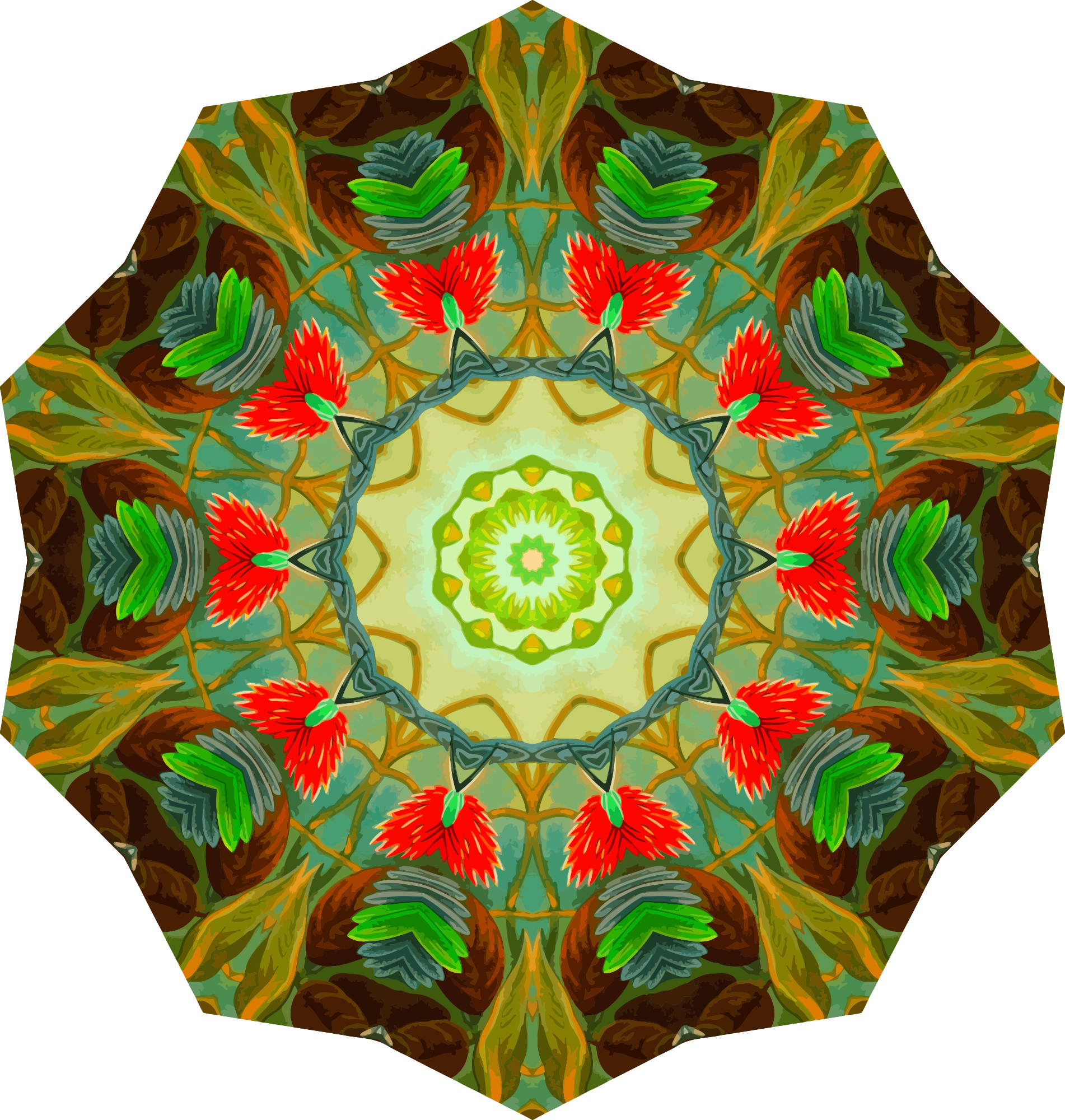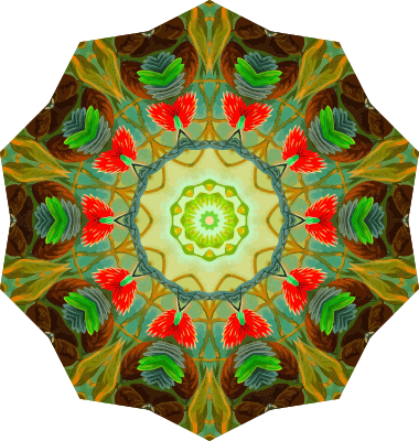 A colourful design with approximate rotational symmetry formed from a drawing of hummingbirds by Ernst Haeckel. The design was drawn as a PNG in Paint.net by repeated rotation of wedges of the drawing around a centre point. It was vectorized in Vector Magic.