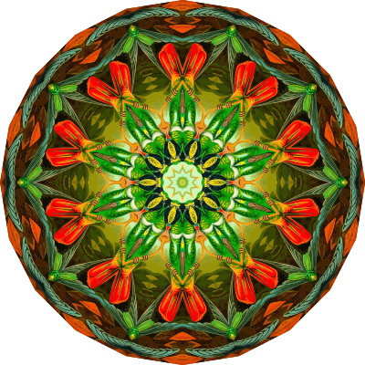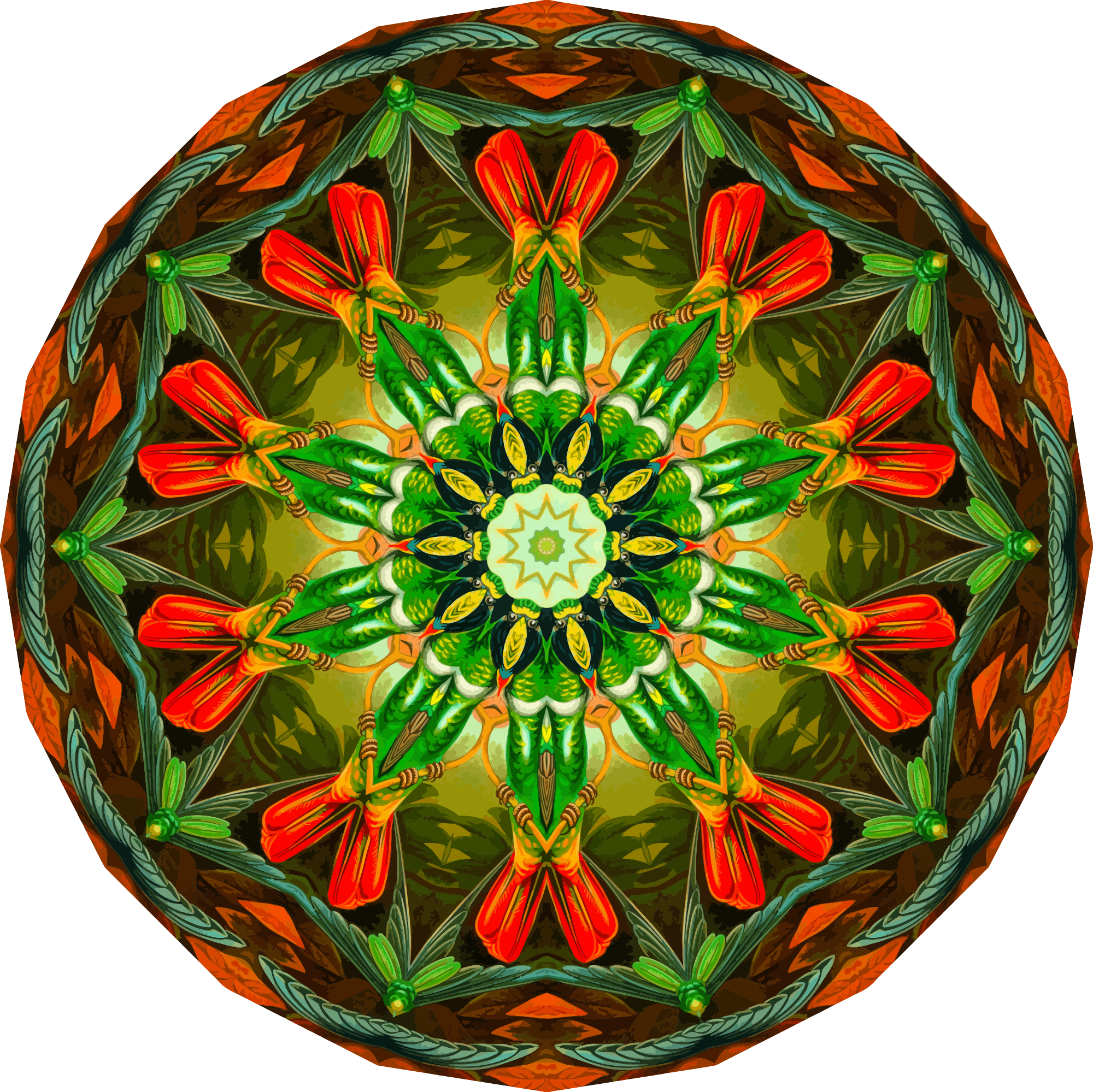 A colourful design with approximate rotational symmetry formed from a drawing of hummingbirds by Ernst Haeckel. The design was drawn as a PNG in Paint.net by repeated rotation of wedges of the drawing around a centre point. It was vectorized in Vector Magic.