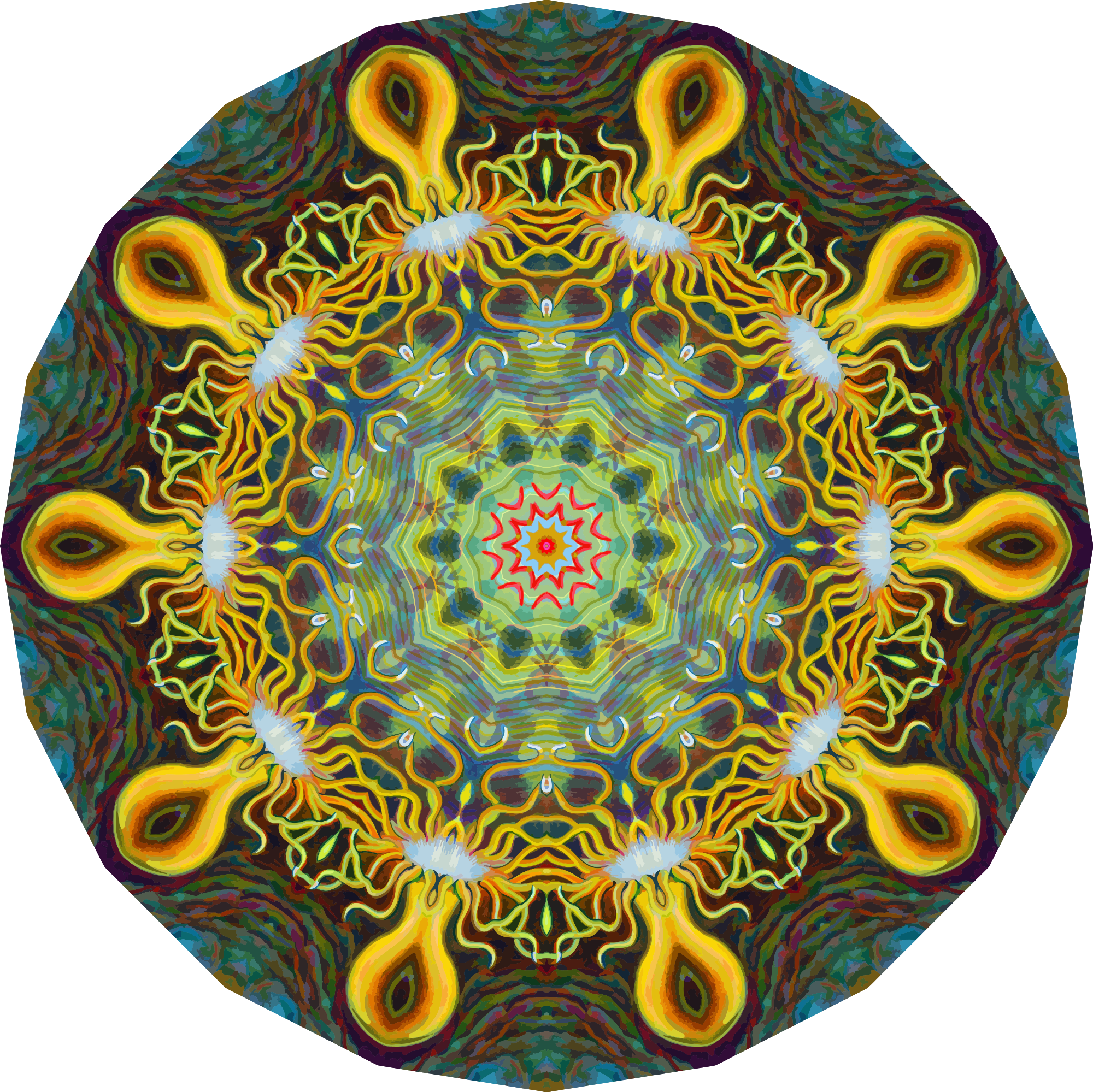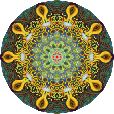 A colourful design with approximate rotational symmetry formed from a drawing of sea anemone by Ernst Haeckel. The design was drawn as a PNG in Paint.net by repeated rotation of wedges of the drawing around a centre point. It was vectorized in Vector Magic.