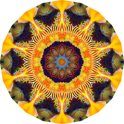 A colourful design with approximate rotational symmetry formed from a drawing of sea anemone by Ernst Haeckel. The design was drawn as a PNG in Paint.net by repeated rotation of wedges of the drawing around a centre point. It was vectorized in Vector Magic.