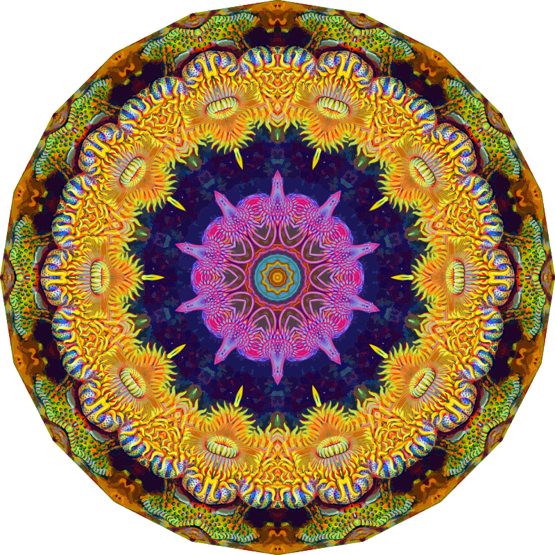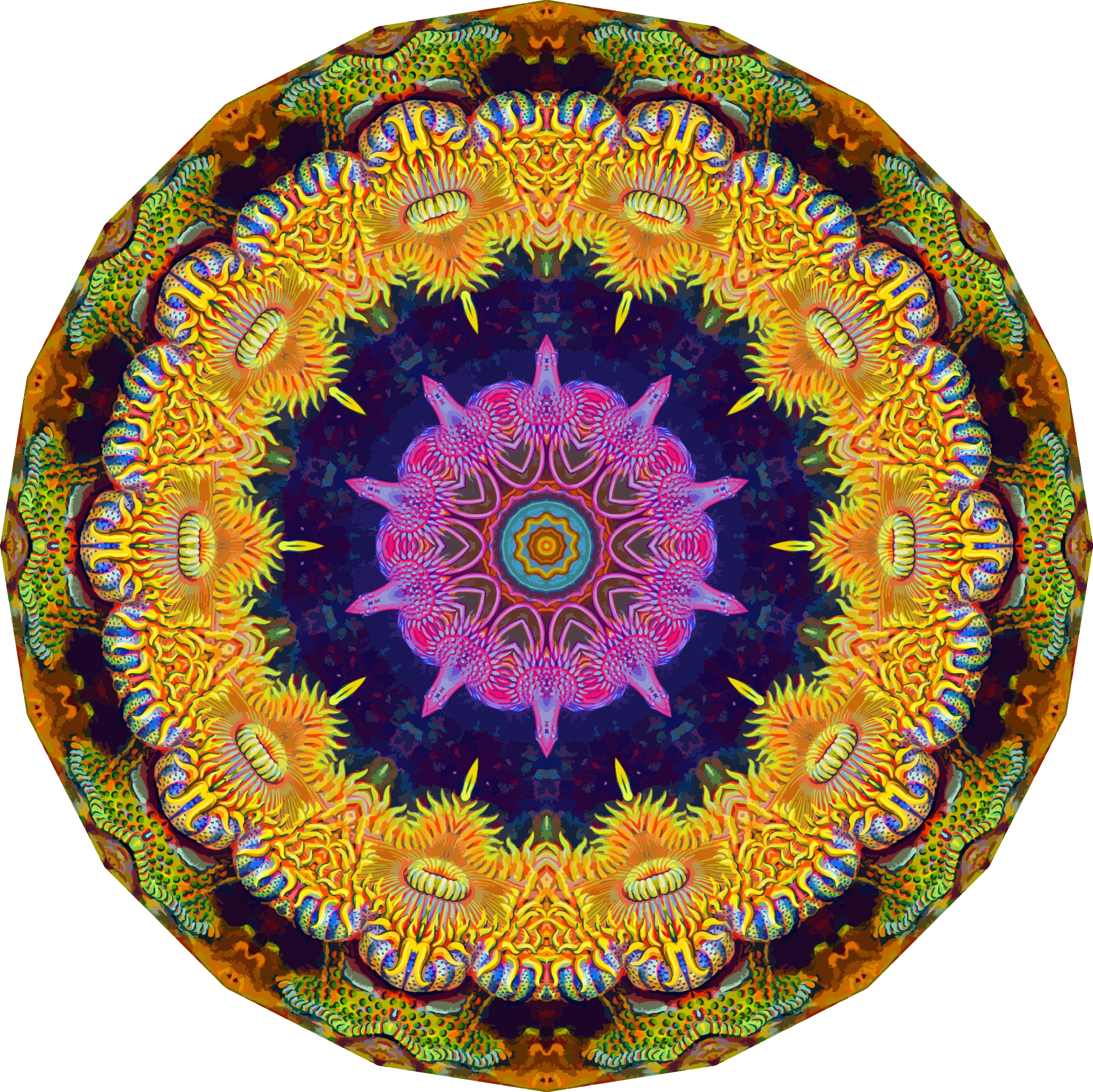 A colourful design with approximate rotational symmetry formed from a drawing of sea anemone by Ernst Haeckel. The design was drawn as a PNG in Paint.net by repeated rotation of wedges of the drawing around a centre point. It was vectorized in Vector Magic.