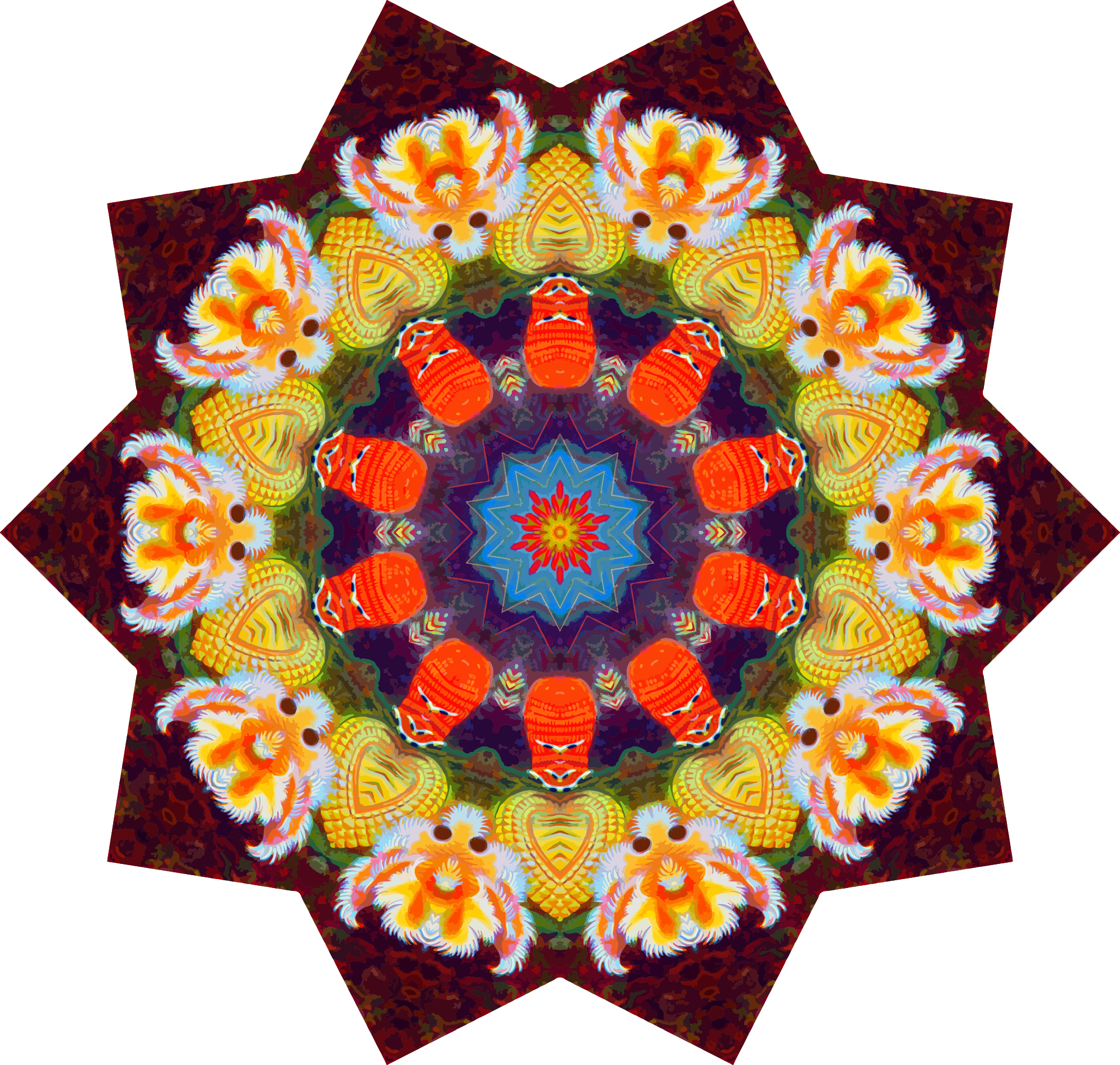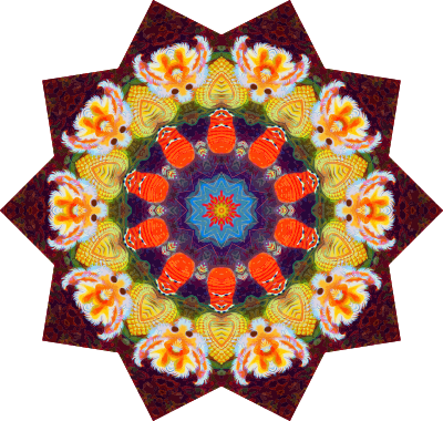 A colourful design with approximate rotational symmetry formed from a drawing of sea anemone by Ernst Haeckel. The design was drawn as a PNG in Paint.net by repeated rotation of wedges of the drawing around a centre point. It was vectorized in Vector Magic.
