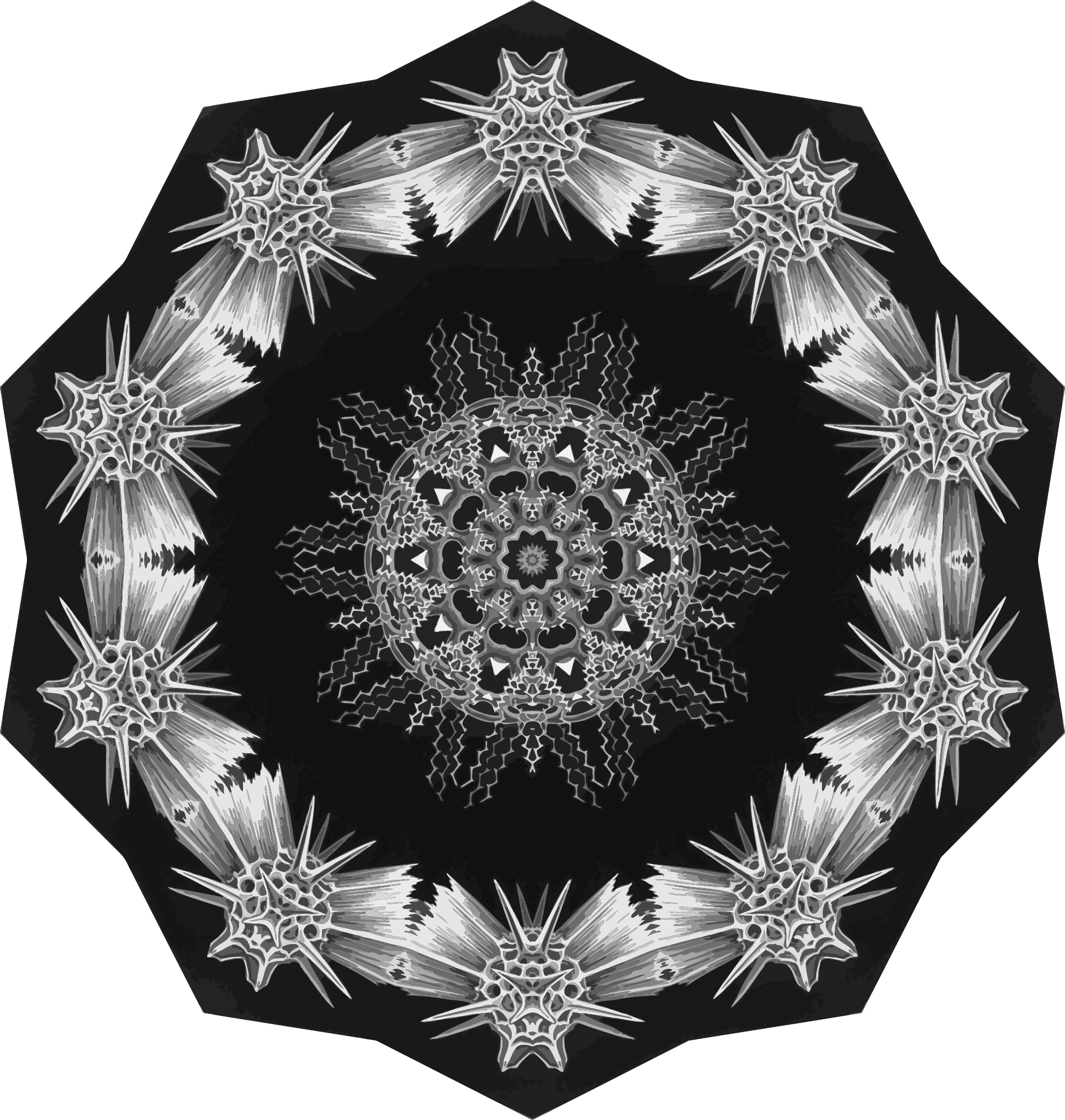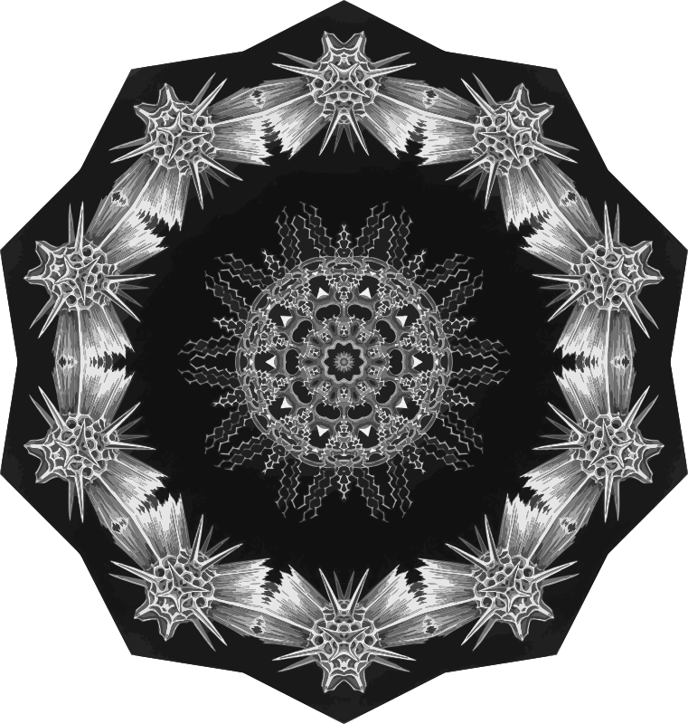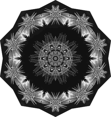 A design with approximate rotational symmetry formed from a drawing of algae by Ernst Haeckel. The design was drawn as a PNG in Paint.net by repeated rotation of wedges of the drawing around a centre point. It was vectorized in Vector Magic.