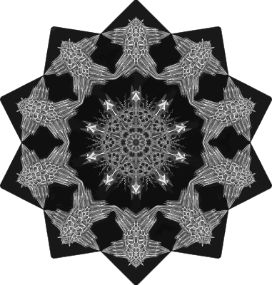 A design with approximate rotational symmetry formed from a drawing of algae by Ernst Haeckel. The design was drawn as a PNG in Paint.net by repeated rotation of wedges of the drawing around a centre point. It was vectorized in Vector Magic.