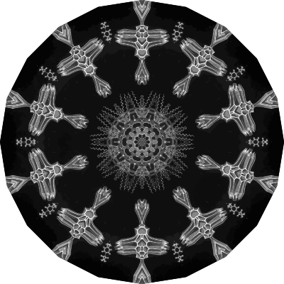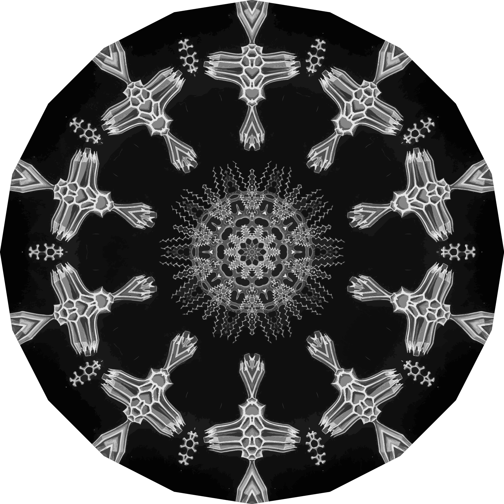 A design with approximate rotational symmetry formed from a drawing of algae by Ernst Haeckel. The design was drawn as a PNG in Paint.net by repeated rotation of wedges of the drawing around a centre point. It was vectorized in Vector Magic.