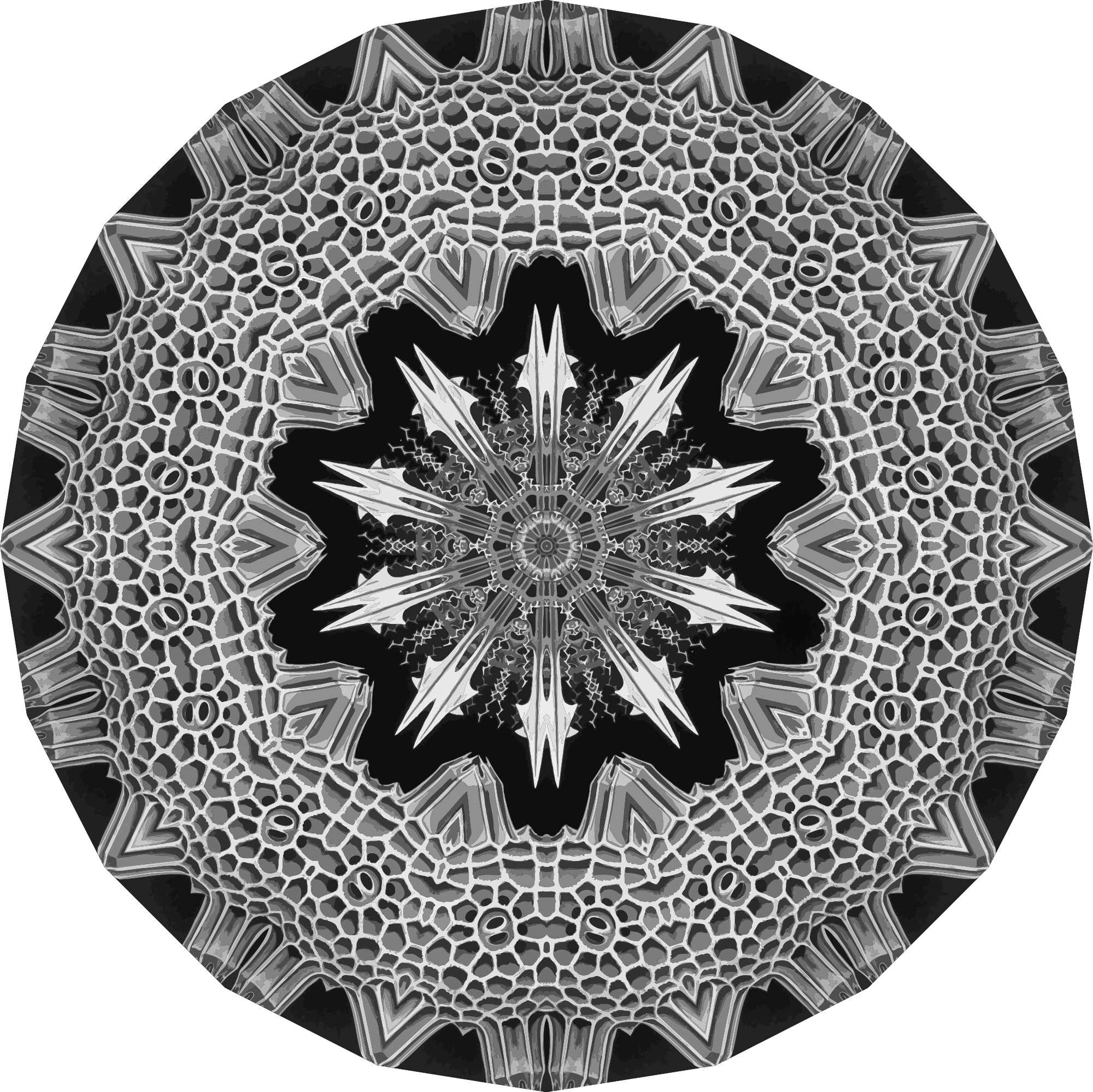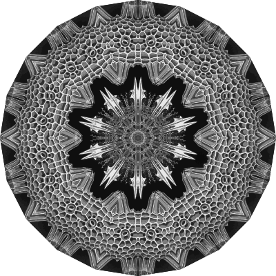 A design with approximate rotational symmetry formed from a drawing of algae by Ernst Haeckel. The design was drawn as a PNG in Paint.net by repeated rotation of wedges of the drawing around a centre point. It was vectorized in Vector Magic.