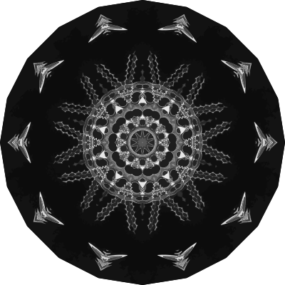 A design with approximate rotational symmetry formed from a drawing of algae by Ernst Haeckel. The design was drawn as a PNG in Paint.net by repeated rotation of wedges of the drawing around a centre point. It was vectorized in Vector Magic.