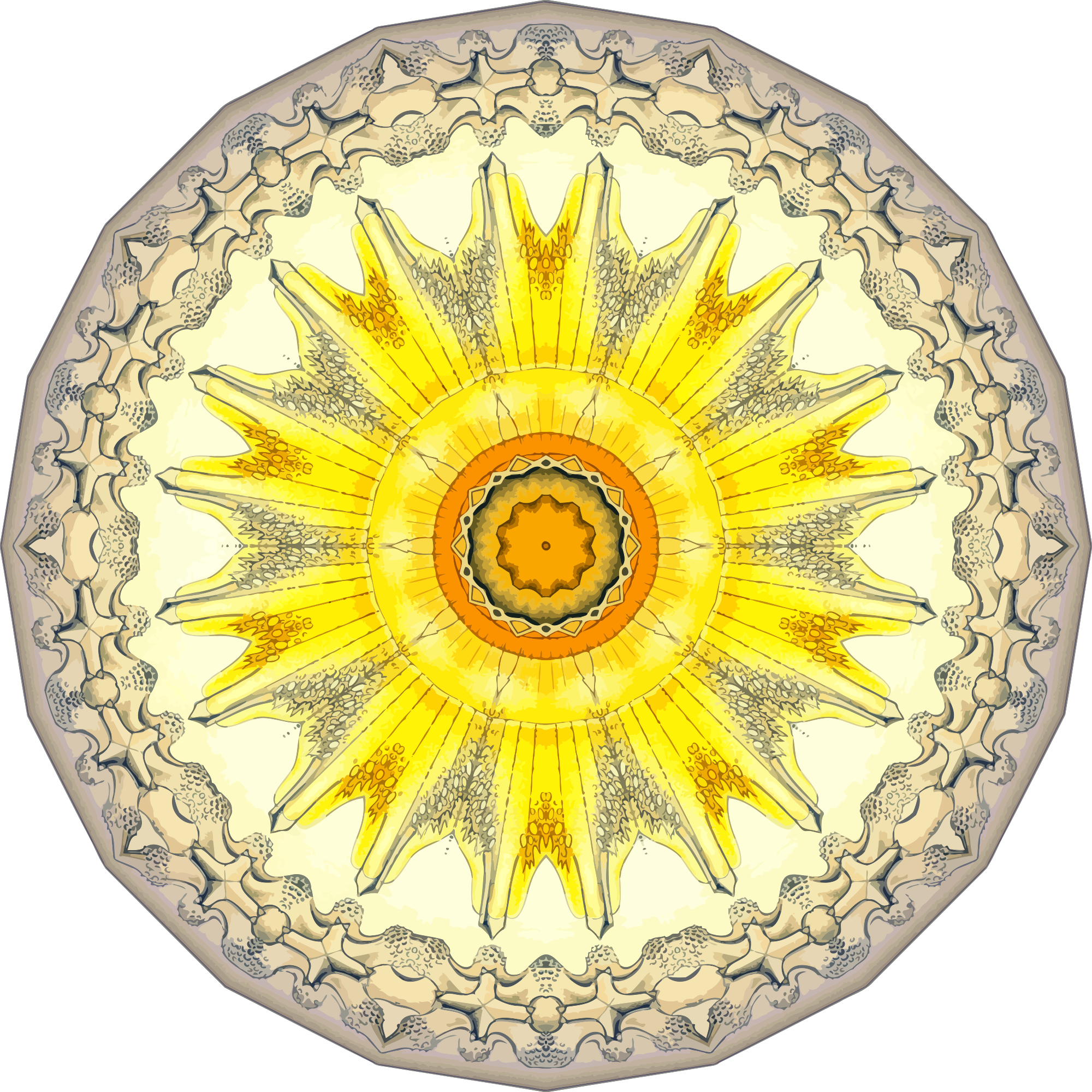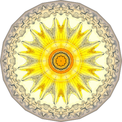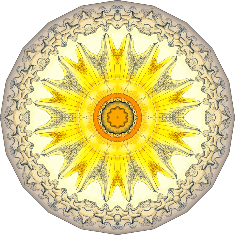 A design with approximate rotational symmetry formed from a drawing of acanthometra by Ernst Haeckel. The design was drawn as a PNG in Paint.net by repeated rotation of wedges of the drawing around a centre point. It was vectorized in Vector Magic