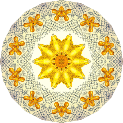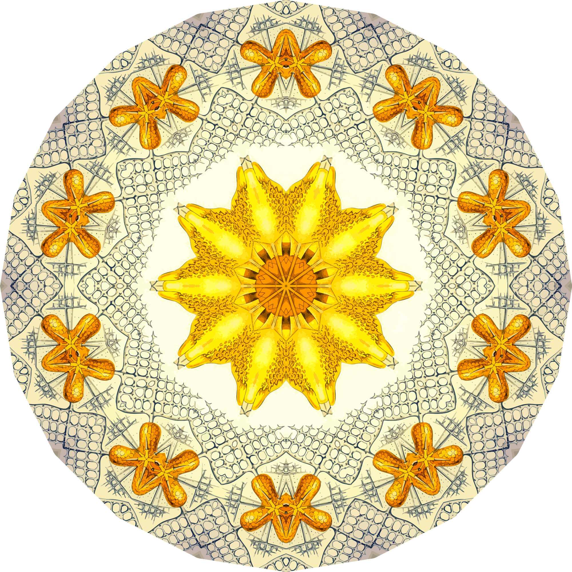 A design with approximate rotational symmetry formed from a drawing of acanthometra by Ernst Haeckel. The design was drawn as a PNG in Paint.net by repeated rotation of wedges of the drawing around a centre point. It was vectorized in Vector Magic
