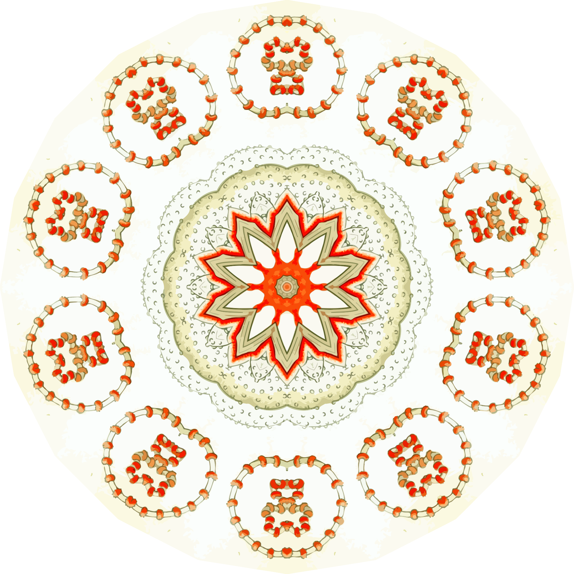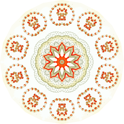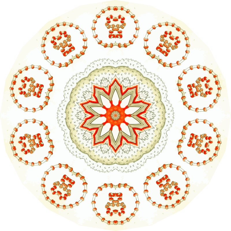A design with approximate rotational symmetry formed from a drawing of marine invertebrates by Ernst Haeckel. The design was drawn as a PNG in Paint.net by repeated rotation of wedges of the drawing around a centre point. It was vectorized in Vector Magic