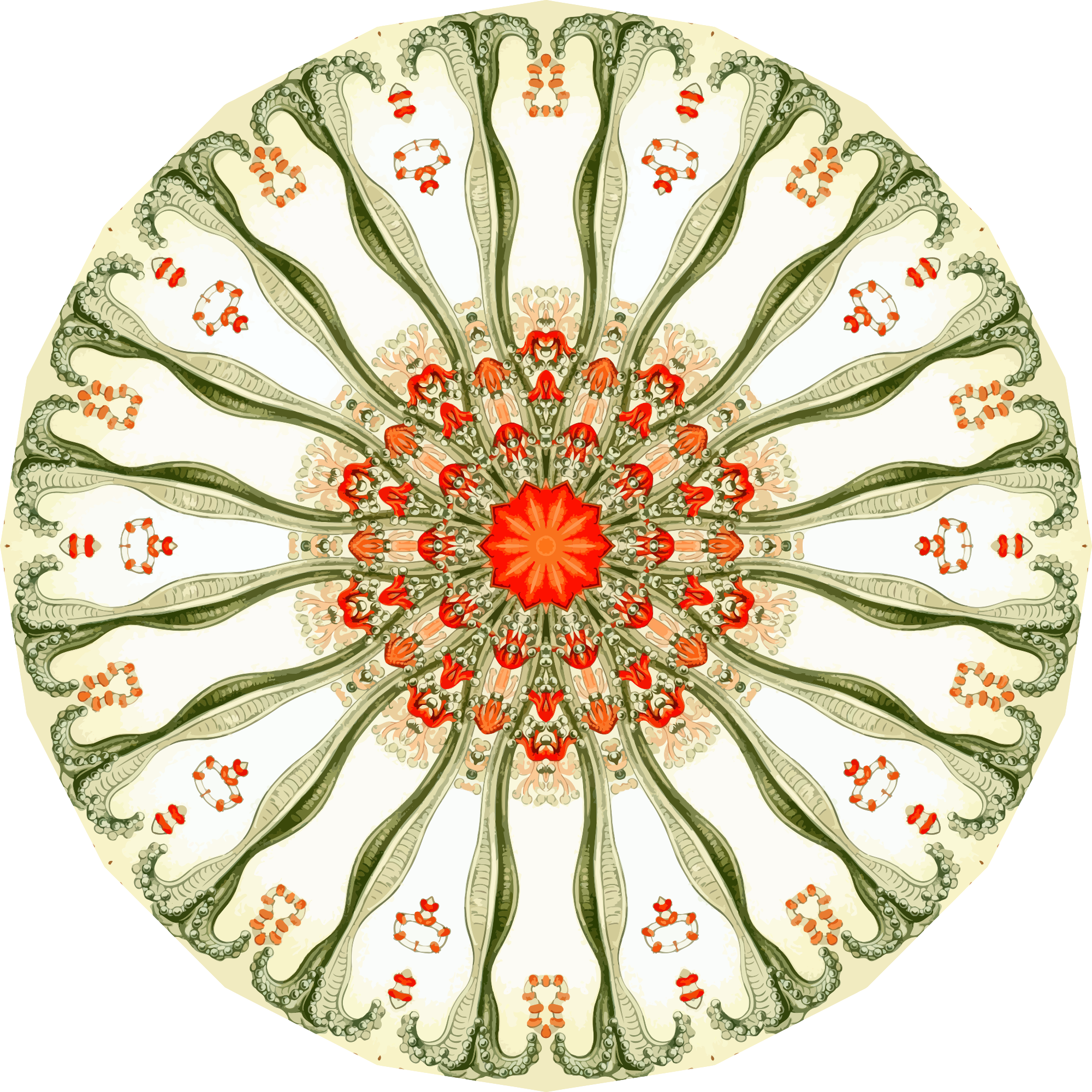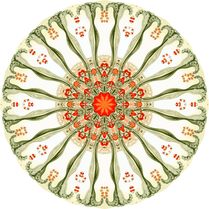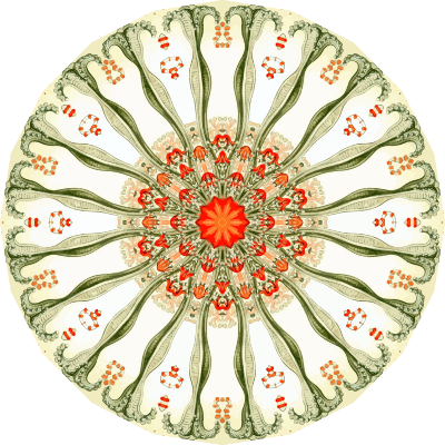 A design with approximate rotational symmetry formed from a drawing of marine invertebrates by Ernst Haeckel. The design was drawn as a PNG in Paint.net by repeated rotation of wedges of the drawing around a centre point. It was vectorized in Vector Magic