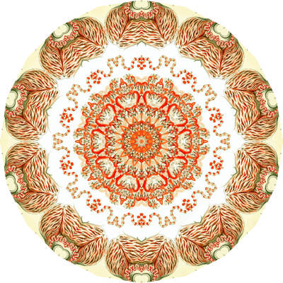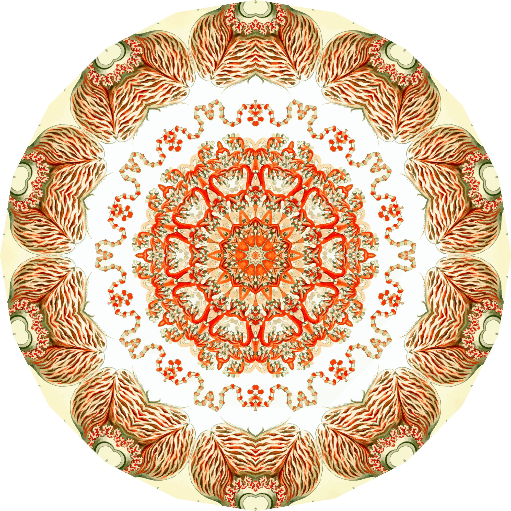 A design with approximate rotational symmetry formed from a drawing of marine invertebrates by Ernst Haeckel. The design was drawn as a PNG in Paint.net by repeated rotation of wedges of the drawing around a centre point. It was vectorized in Vector Magic