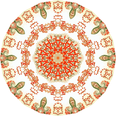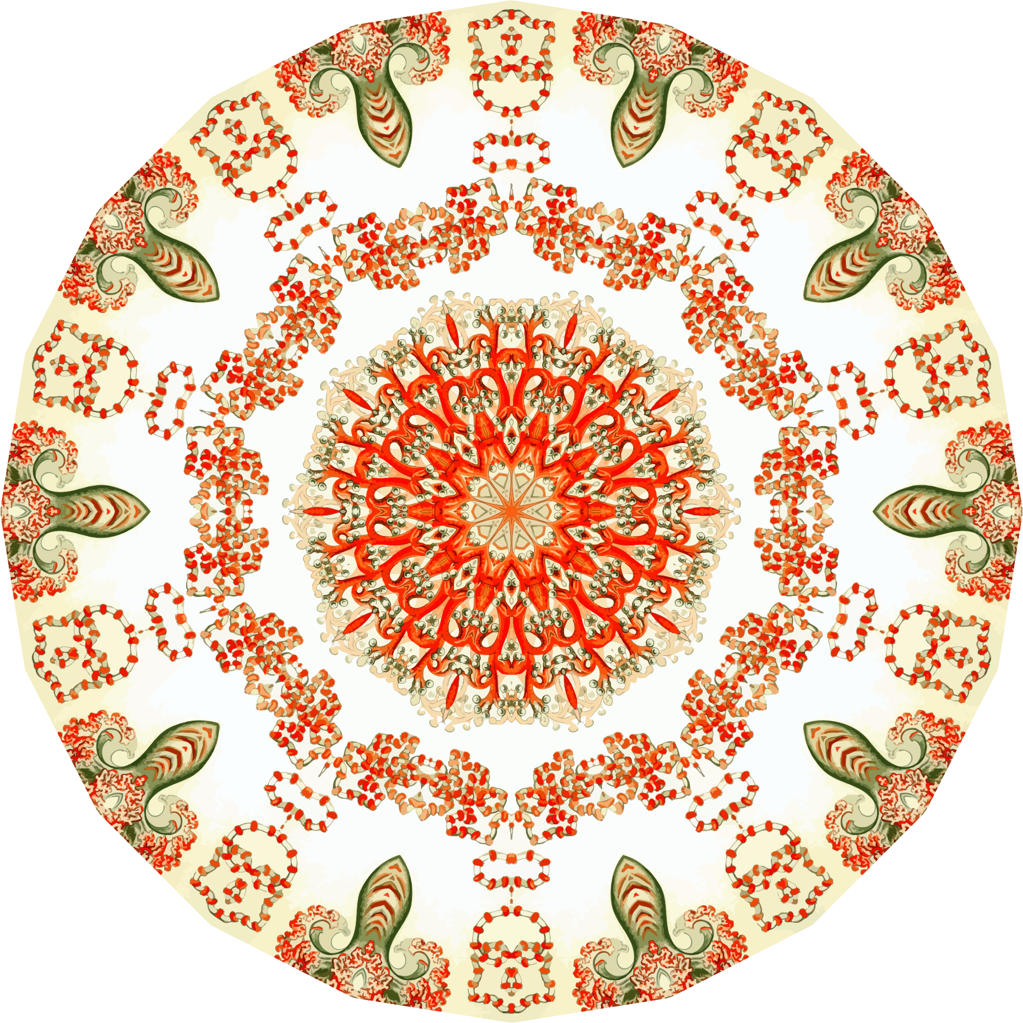 A design with approximate rotational symmetry formed from a drawing of marine invertebrates by Ernst Haeckel. The design was drawn as a PNG in Paint.net by repeated rotation of wedges of the drawing around a centre point. It was vectorized in Vector Magic