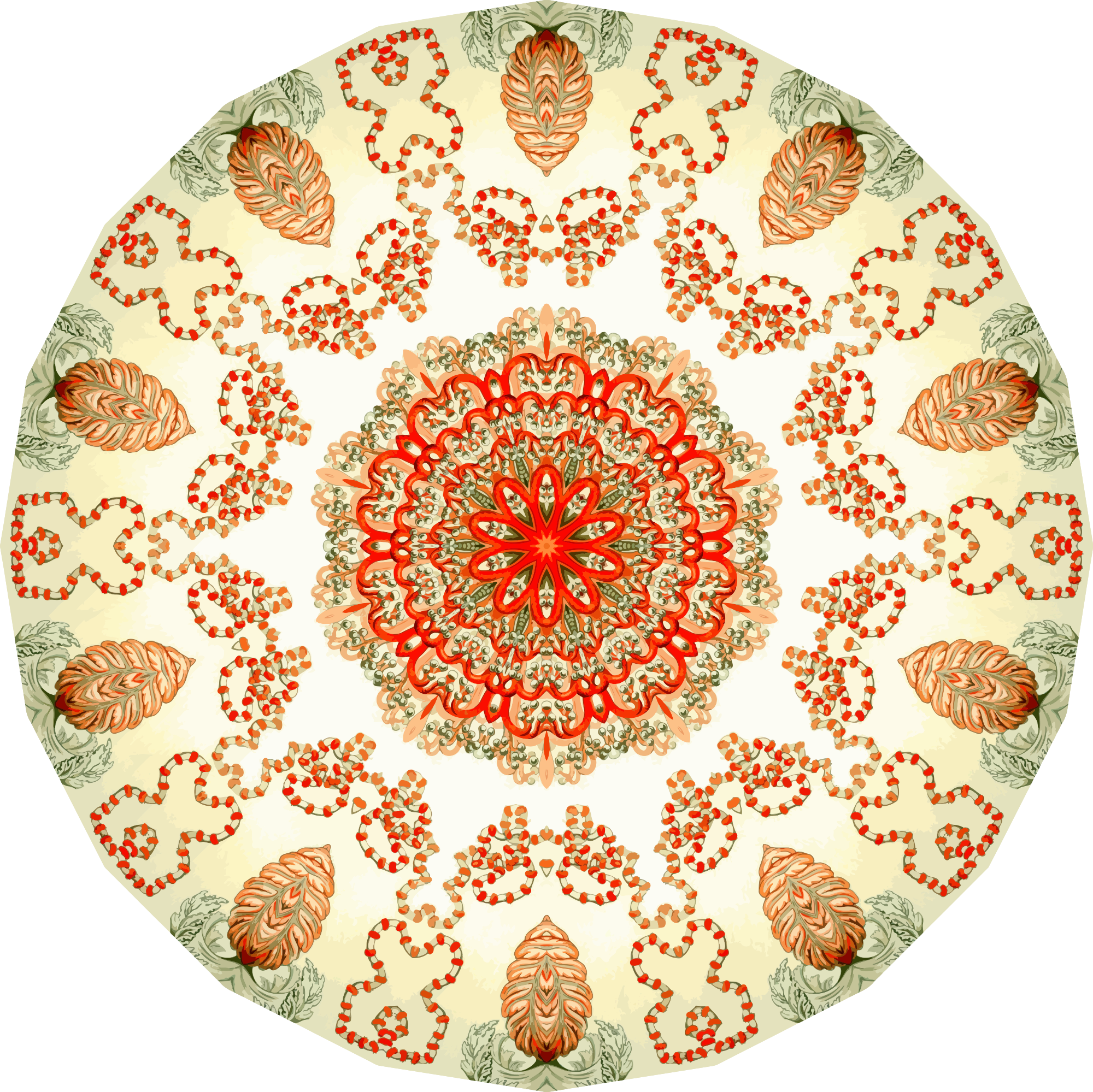 A design with approximate rotational symmetry formed from a drawing of marine invertebrates by Ernst Haeckel. The design was drawn as a PNG in Paint.net by repeated rotation of wedges of the drawing around a centre point. It was vectorized in Vector Magic