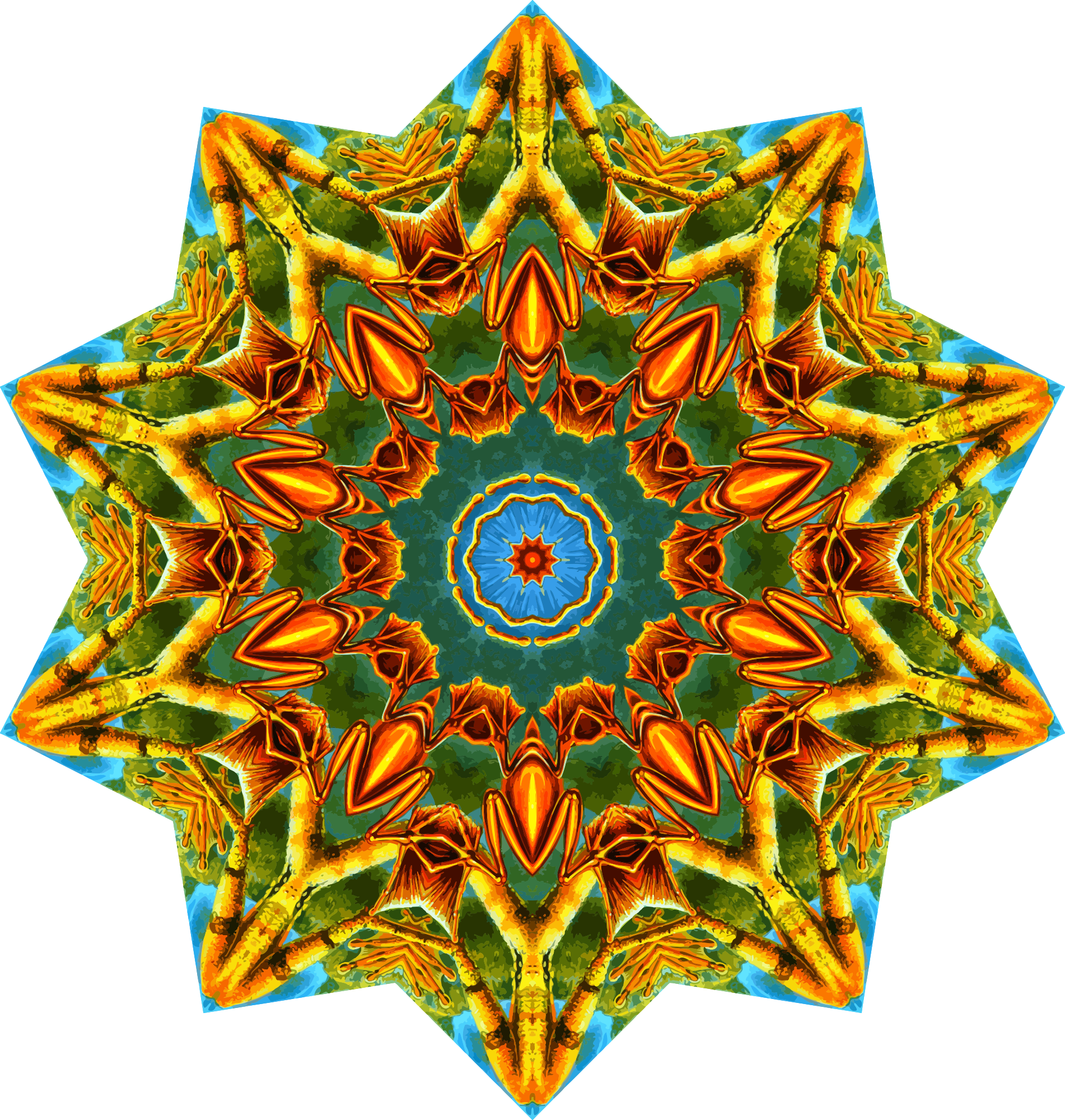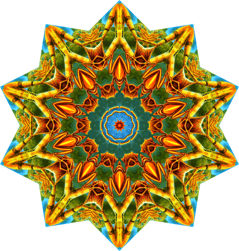A design with approximate rotational symmetry formed from a drawing of amphibians by Ernst Haeckel. The design was drawn as a PNG in Paint.net by repeated rotation of wedges of the drawing around a centre point. It was vectorized in Vector Magic