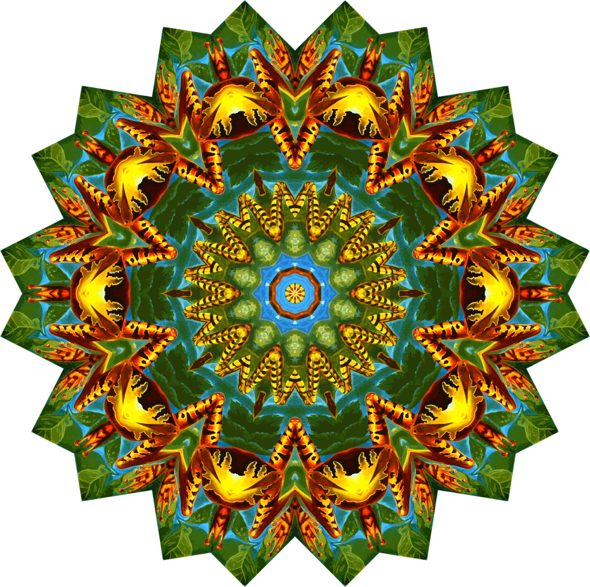 A design with approximate rotational symmetry formed from a drawing of amphibians by Ernst Haeckel. The design was drawn as a PNG in Paint.net by repeated rotation of wedges of the drawing around a centre point. It was vectorized in Vector Magic