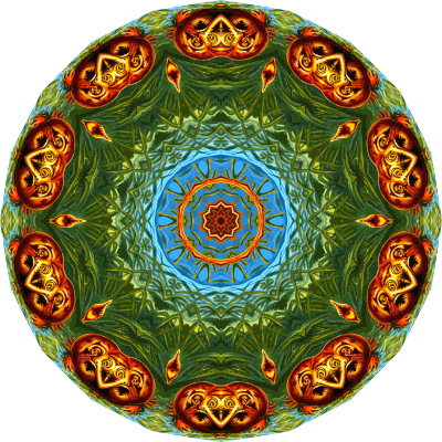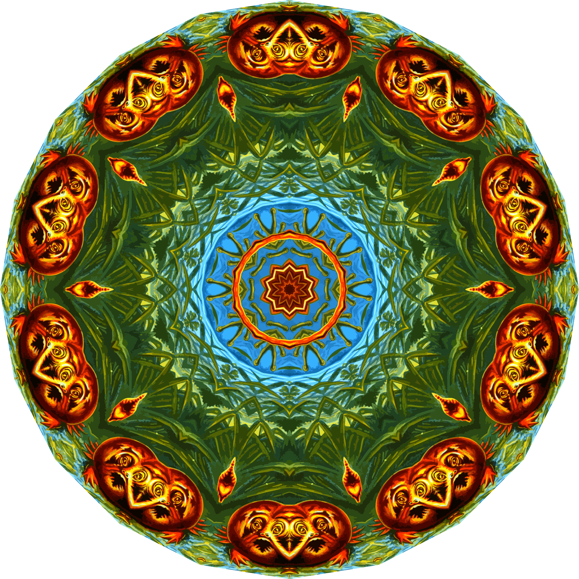 A design with approximate rotational symmetry formed from a drawing of amphibians by Ernst Haeckel. The design was drawn as a PNG in Paint.net by repeated rotation of wedges of the drawing around a centre point. It was vectorized in Vector Magic