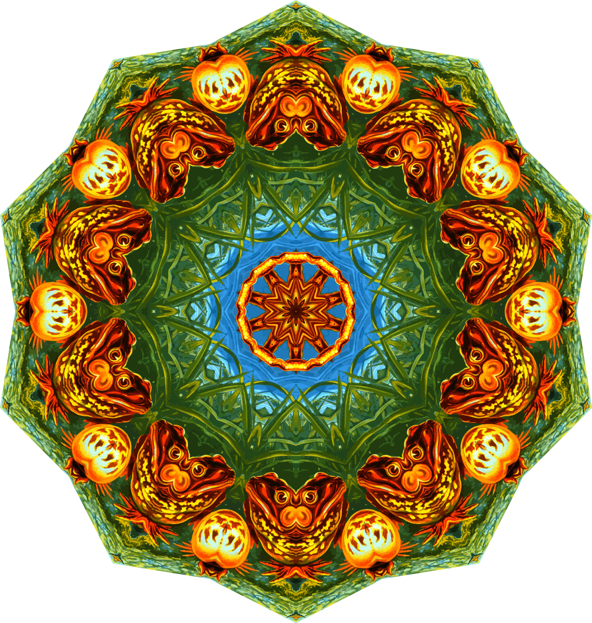 A design with approximate rotational symmetry formed from a drawing of amphibians by Ernst Haeckel. The design was drawn as a PNG in Paint.net by repeated rotation of wedges of the drawing around a centre point. It was vectorized in Vector Magic