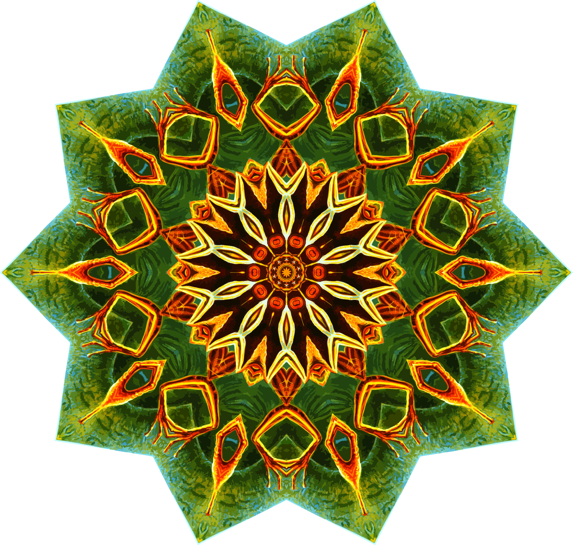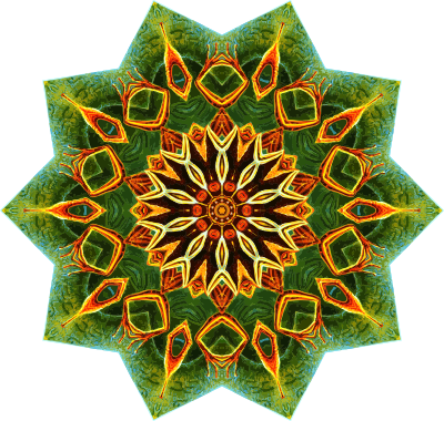 A design with approximate rotational symmetry formed from a drawing of amphibians by Ernst Haeckel. The design was drawn as a PNG in Paint.net by repeated rotation of wedges of the drawing around a centre point. It was vectorized in Vector Magic