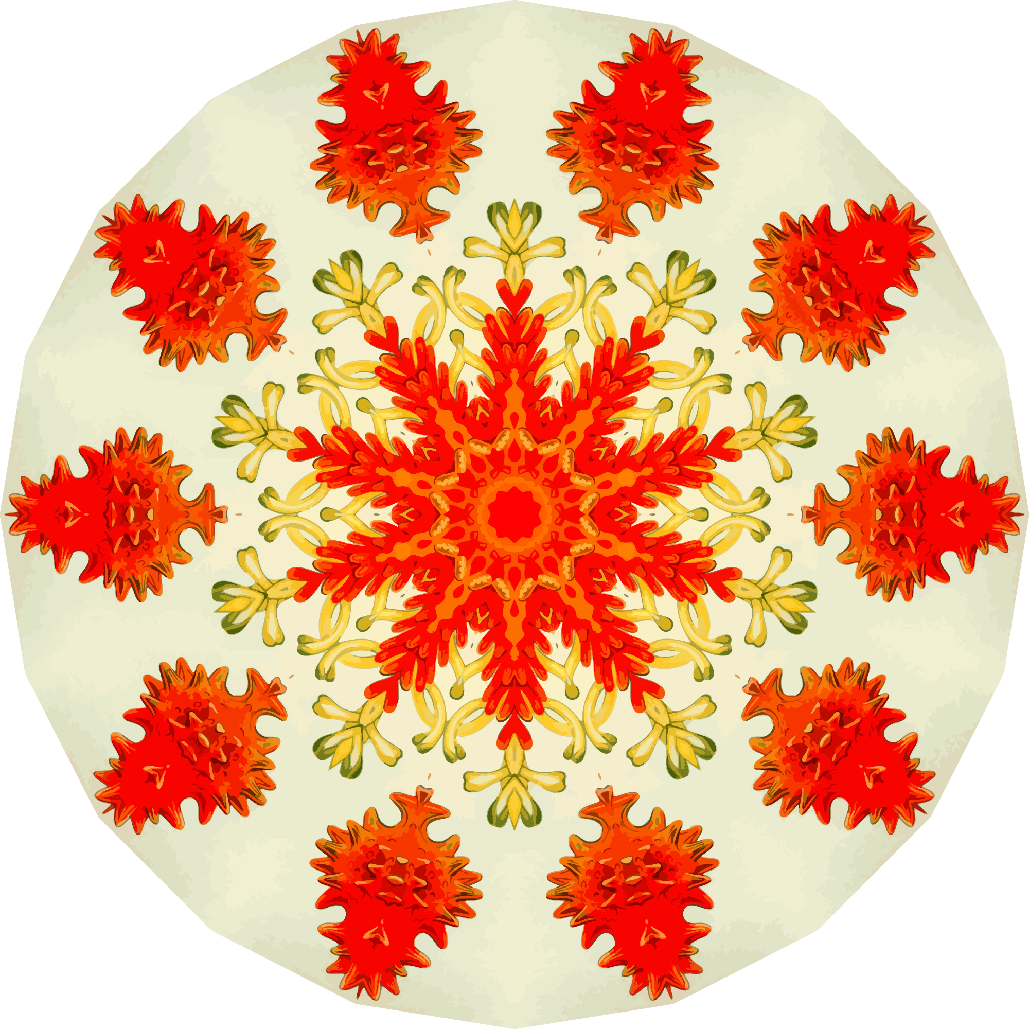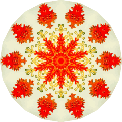 A design with approximate rotational symmetry formed from a drawing of starfish by Ernst Haeckel. The design was drawn as a PNG in Paint.net by repeated rotation of wedges of the drawing around a centre point. It was vectorized in Vector Magic