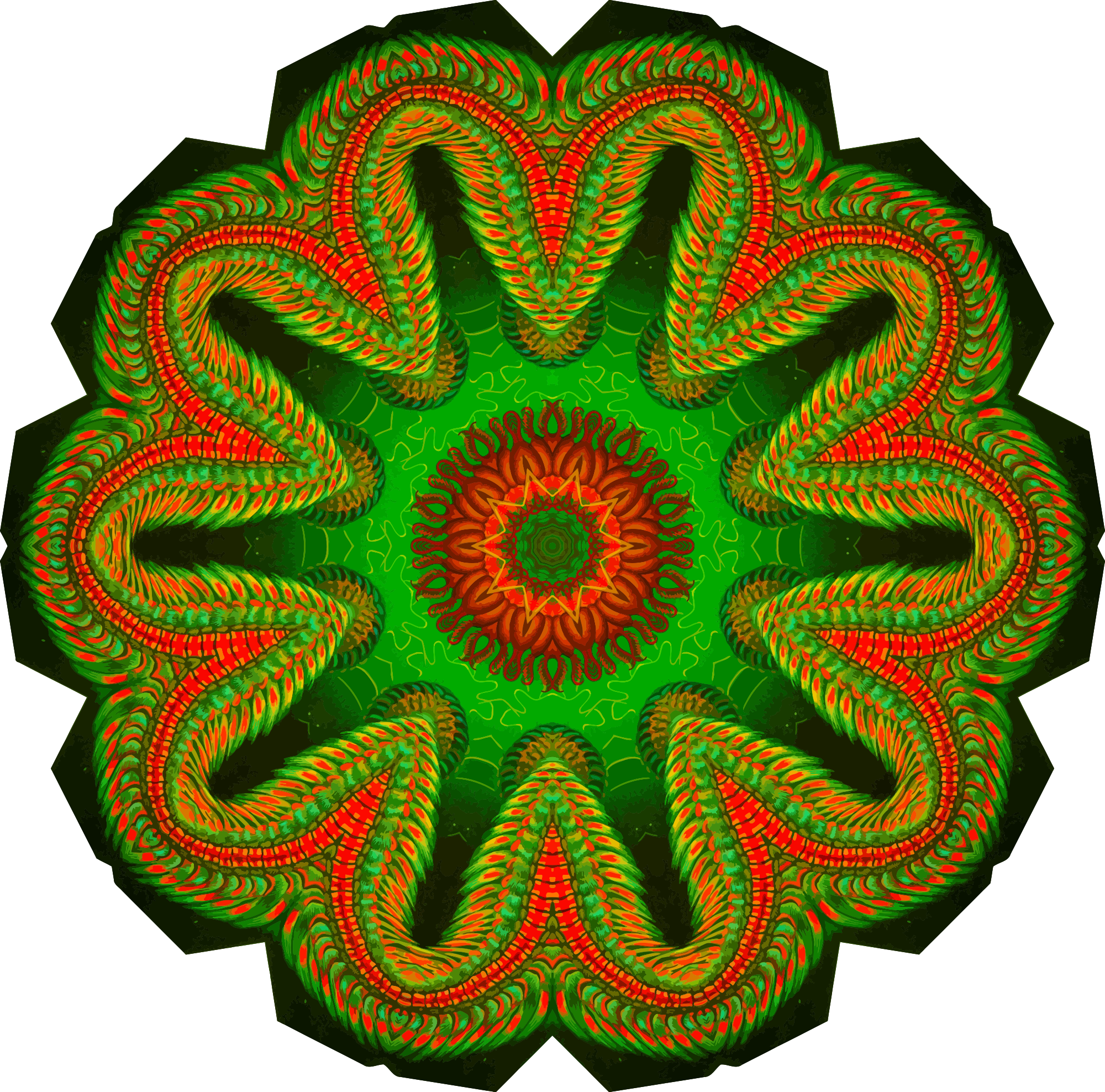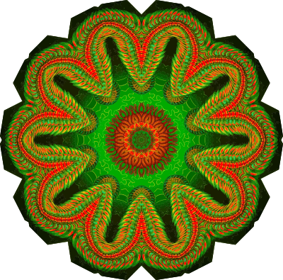 A design with approximate rotational symmetry formed from a drawing of segmented worms by Ernst Haeckel. The design was drawn as a PNG in Paint.net by repeated rotation of wedges of the drawing around a centre point. It was vectorized in Vector Magic