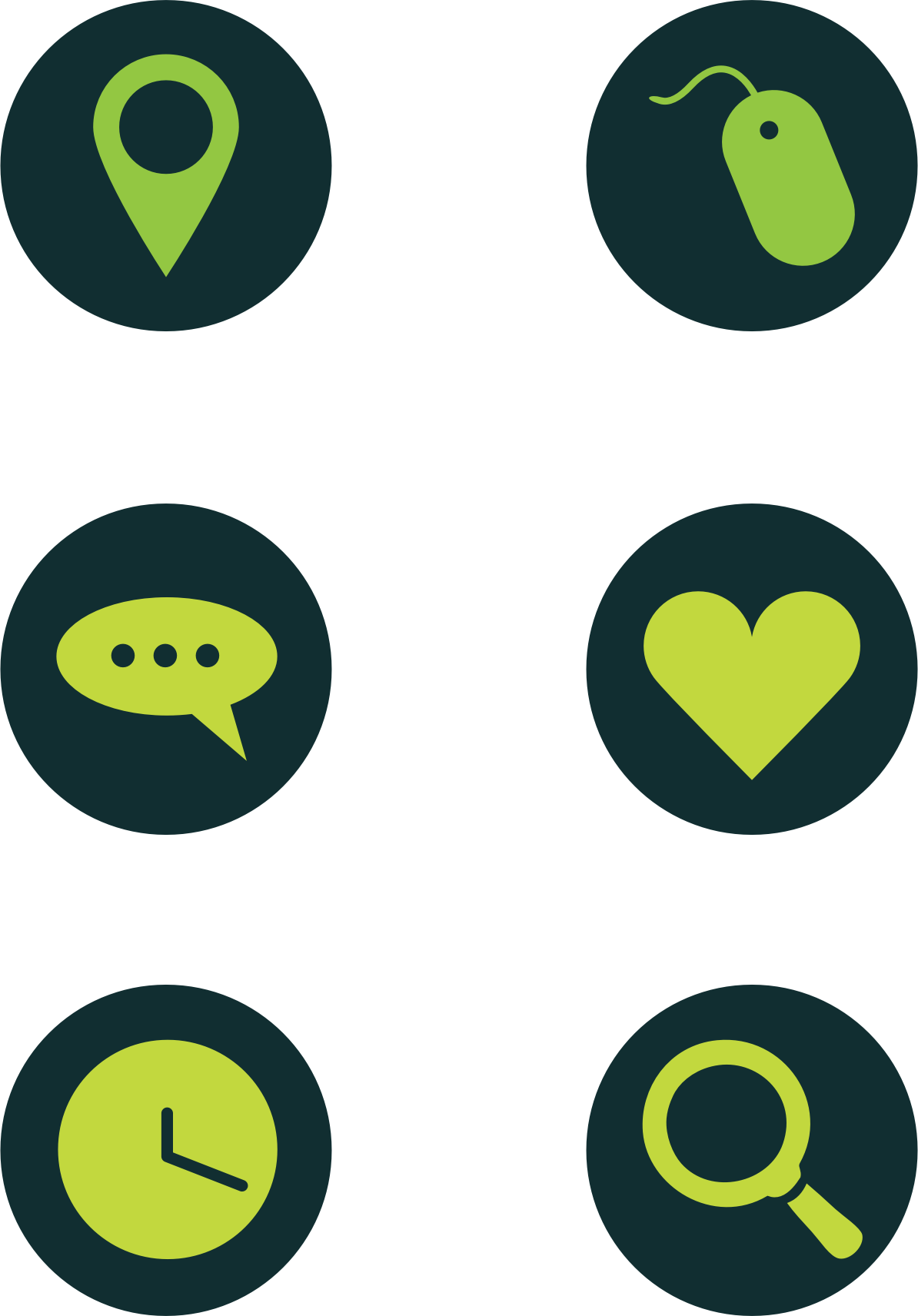 Simple green icons in black circles.