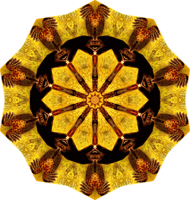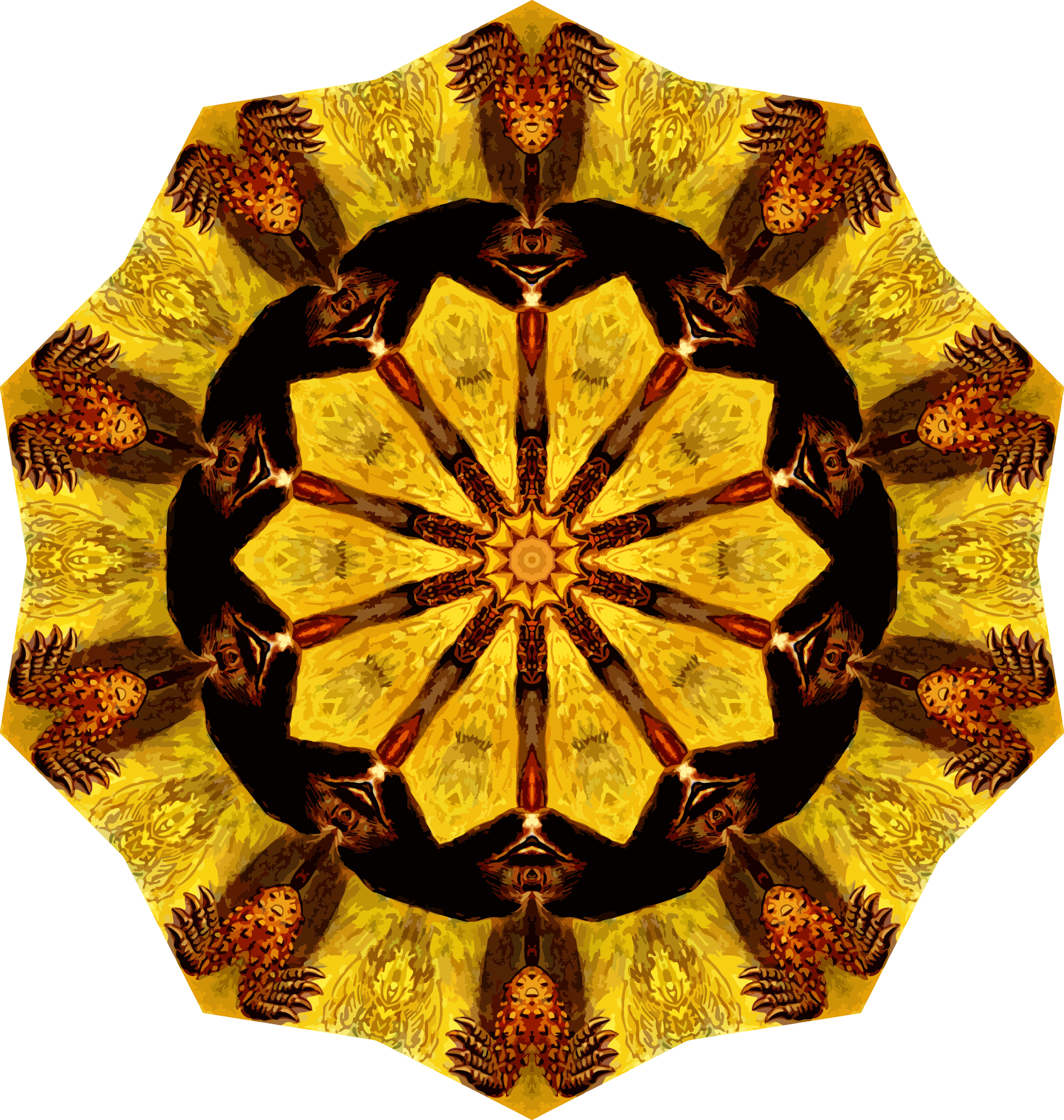 A design with approximate rotational symmetry formed from a drawing of turtles by Ernst Haeckel. The design was drawn as a PNG in Paint.net by repeated rotation of wedges of the drawing around a centre point. It was vectorized in Vector Magic