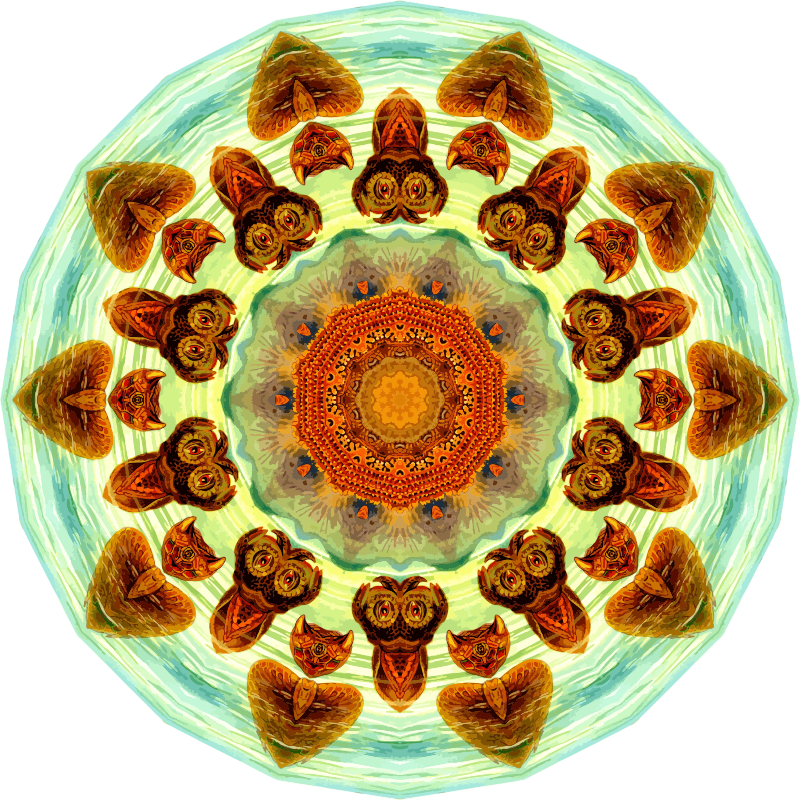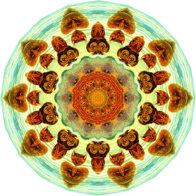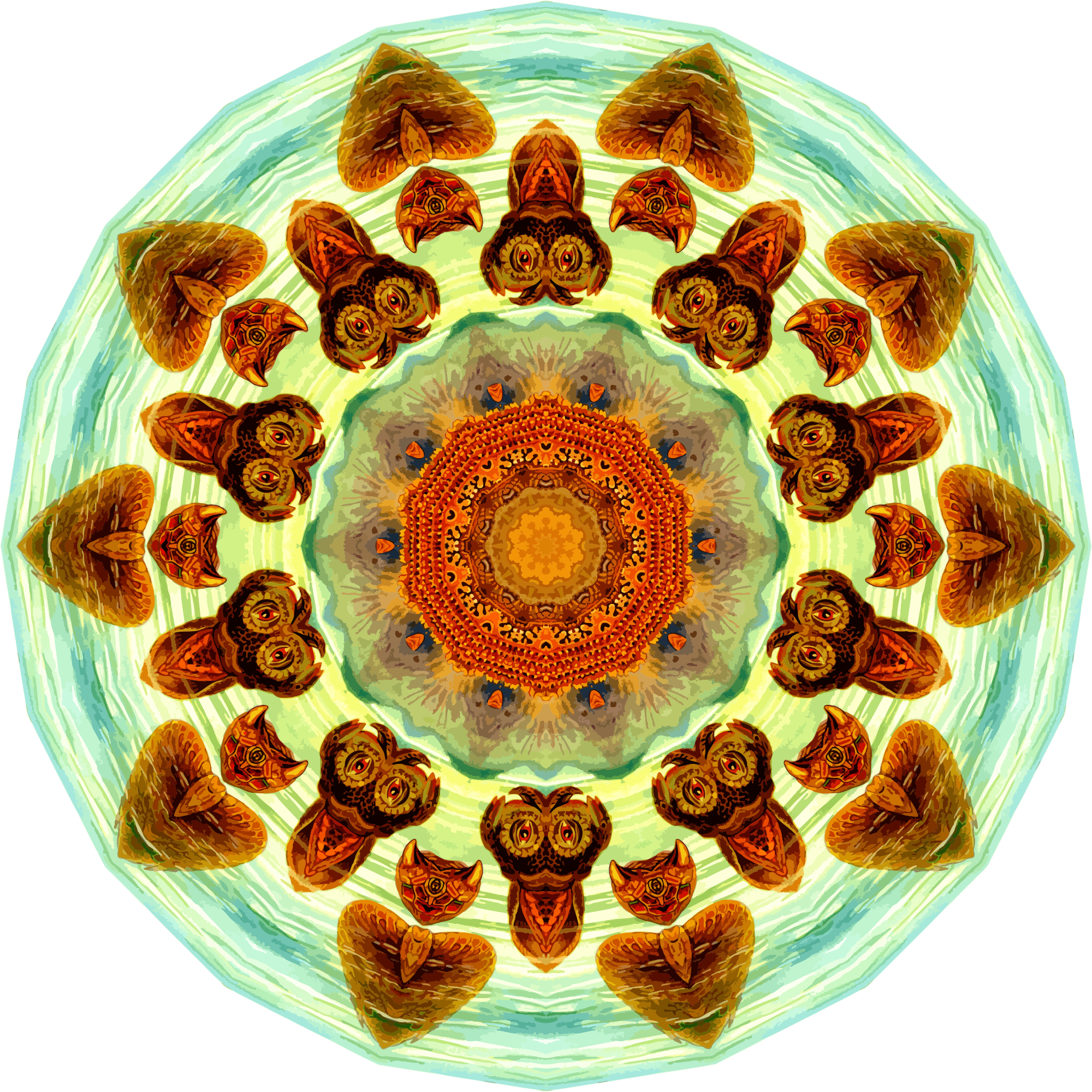A design with approximate rotational symmetry formed from a drawing of turtles by Ernst Haeckel. The design was drawn as a PNG in Paint.net by repeated rotation of wedges of the drawing around a centre point. It was vectorized in Vector Magic