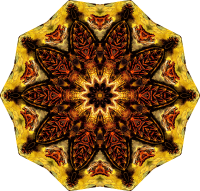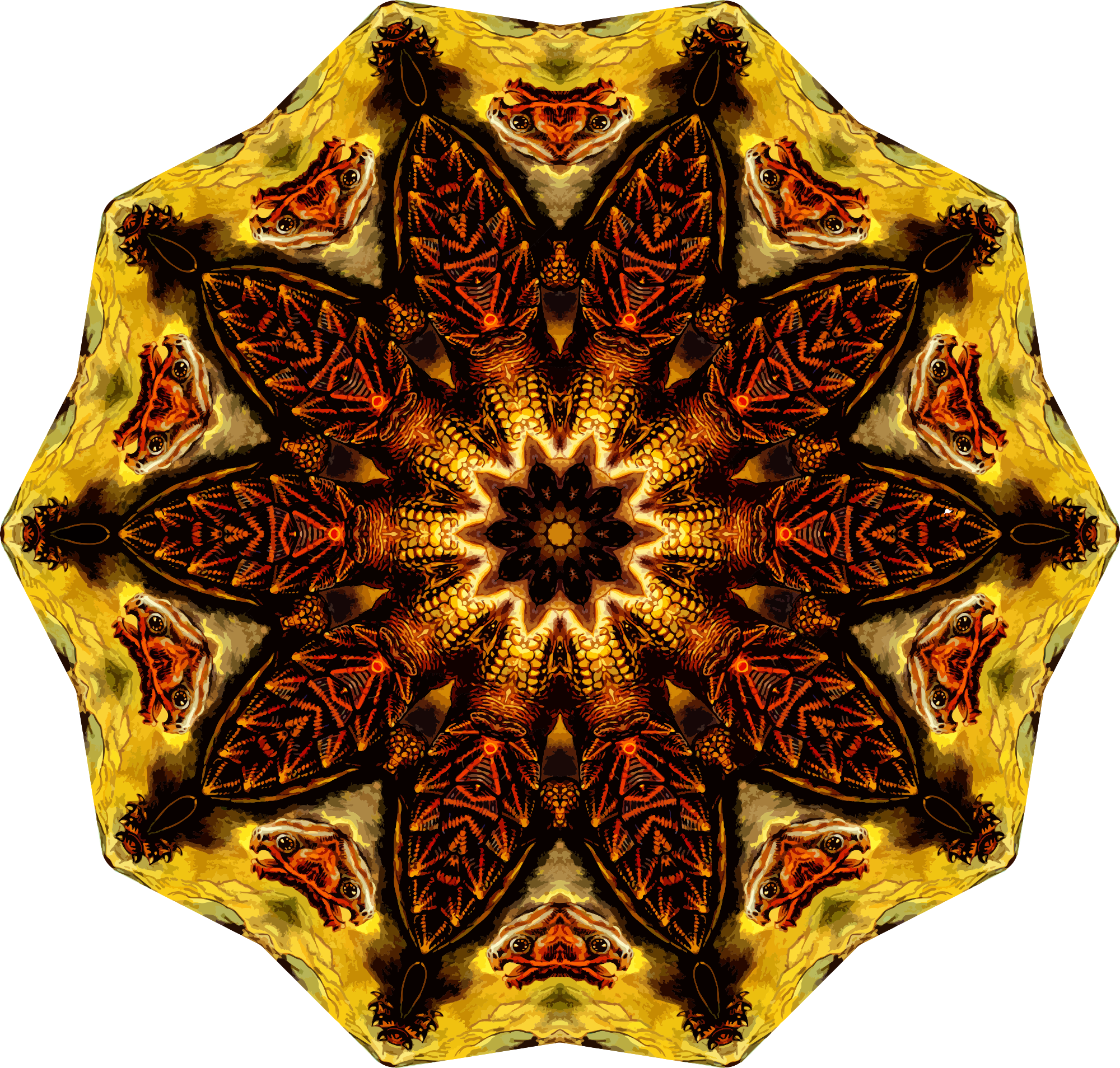 A design with approximate rotational symmetry formed from a drawing of turtles by Ernst Haeckel. The design was drawn as a PNG in Paint.net by repeated rotation of wedges of the drawing around a centre point. It was vectorized in Vector Magic