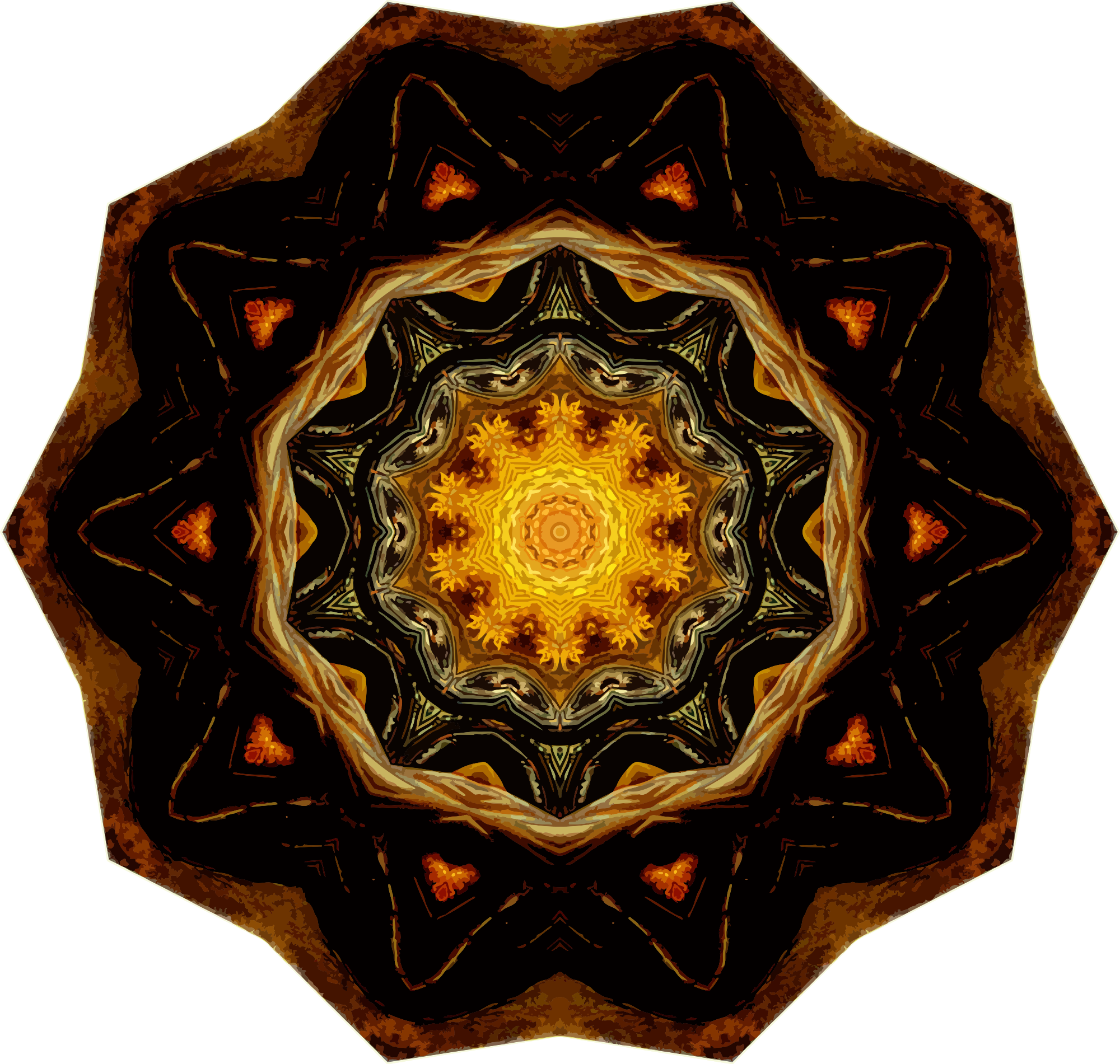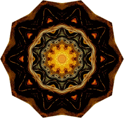 A design with approximate rotational symmetry formed from a drawing of turtles by Ernst Haeckel. The design was drawn as a PNG in Paint.net by repeated rotation of wedges of the drawing around a centre point. It was vectorized in Vector Magic