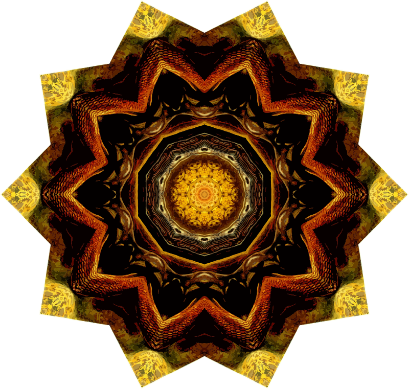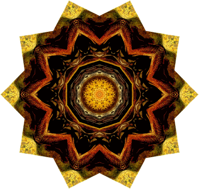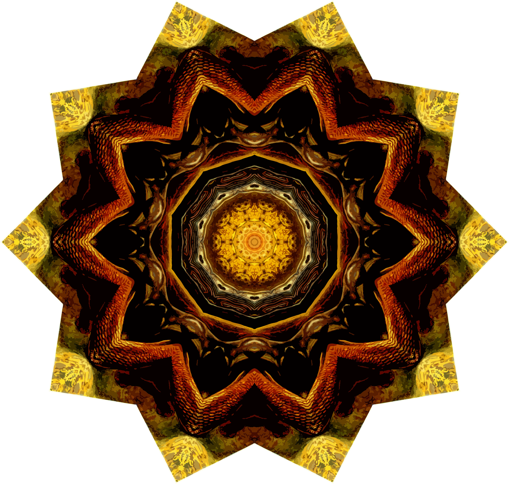 A design with approximate rotational symmetry formed from a drawing of turtles by Ernst Haeckel. The design was drawn as a PNG in Paint.net by repeated rotation of wedges of the drawing around a centre point. It was vectorized in Vector Magic
