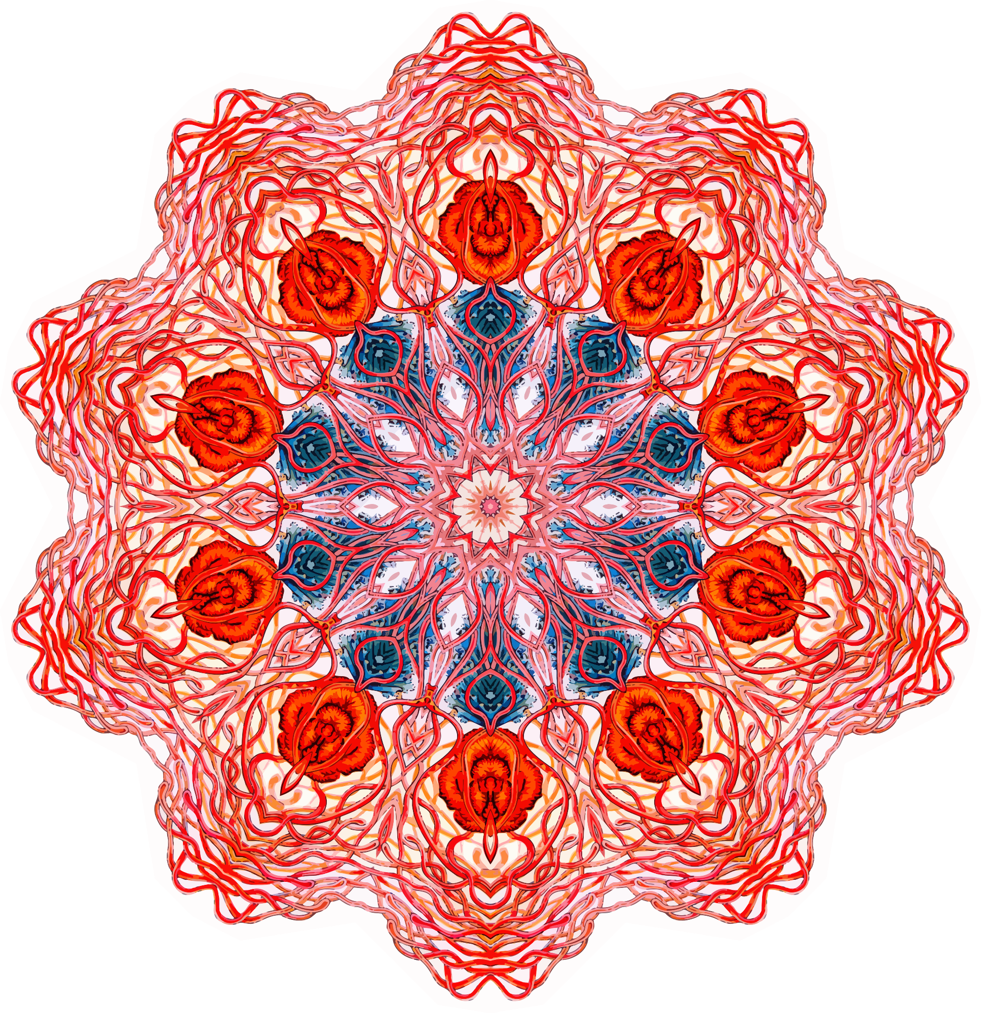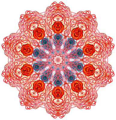 A design with approximate rotational symmetry formed from a drawing of jellyfish by Ernst Haeckel. The design was drawn as a PNG in Paint.net by repeated rotation of wedges of the drawing around a centre point. It was vectorized in Vector Magic