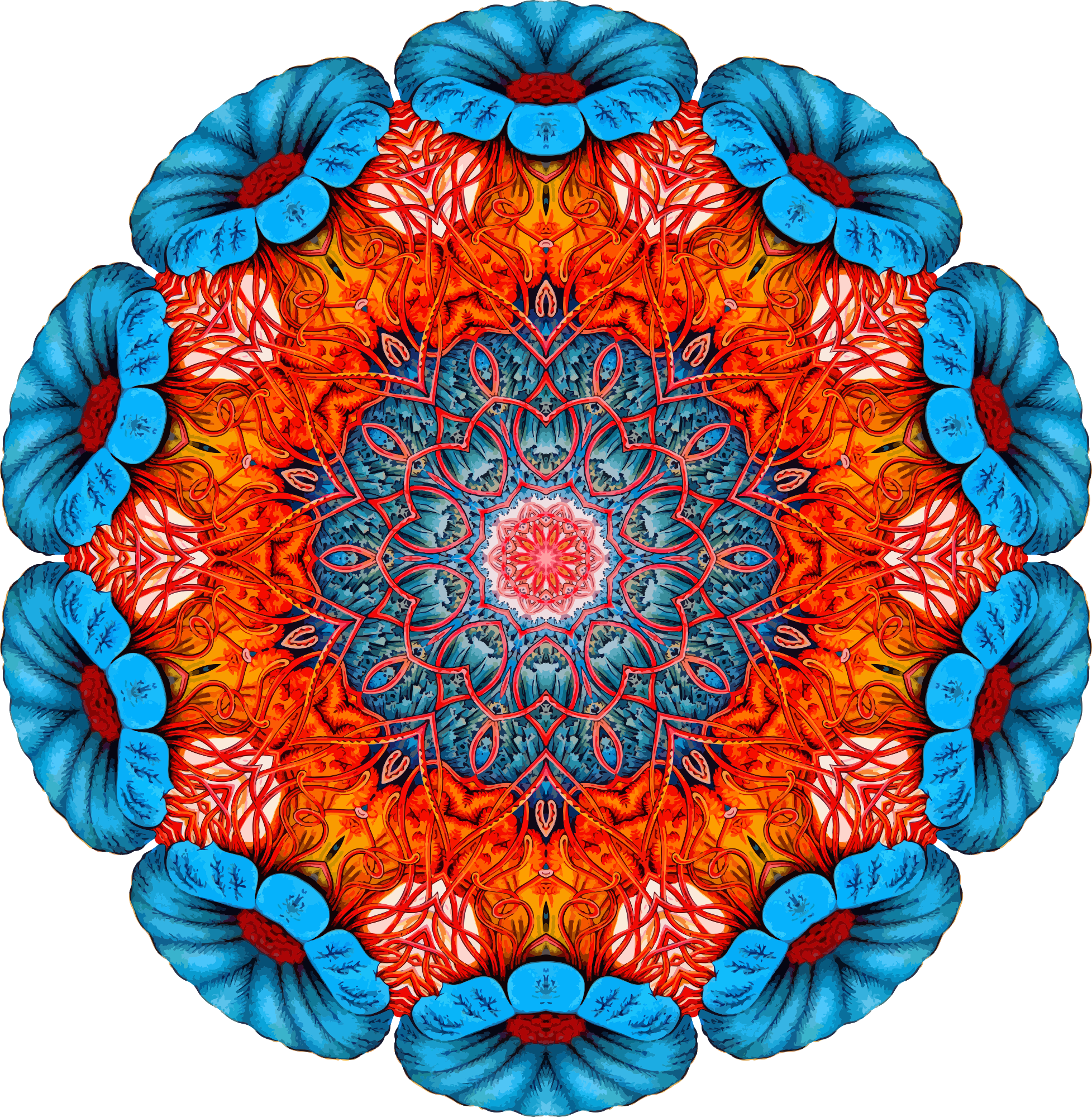A design with approximate rotational symmetry formed from a drawing of jellyfish by Ernst Haeckel. The design was drawn as a PNG in Paint.net by repeated rotation of wedges of the drawing around a centre point. It was vectorized in Vector Magic