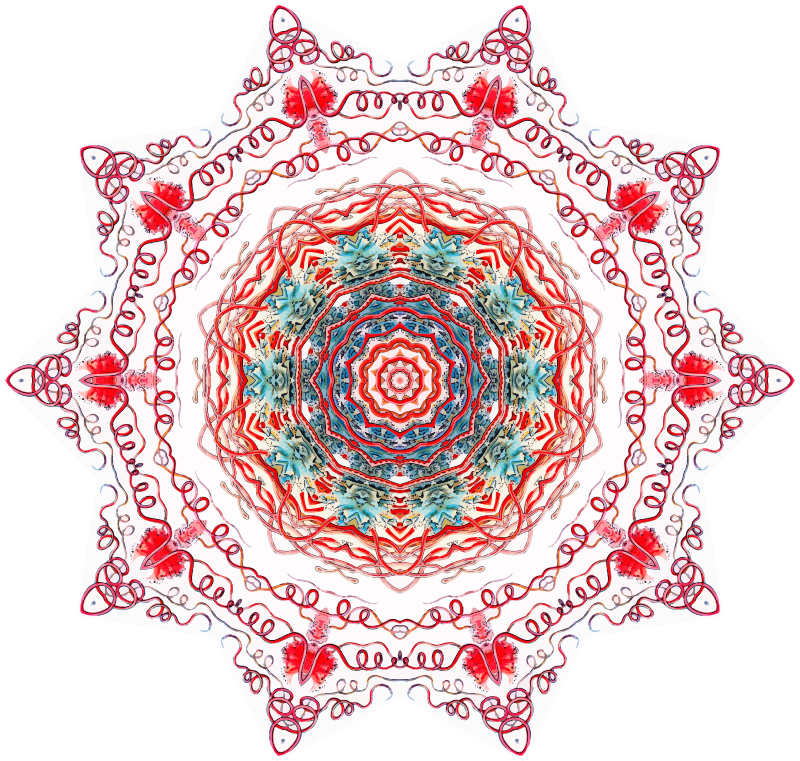 A design with approximate rotational symmetry formed from a drawing of jellyfish by Ernst Haeckel. The design was drawn as a PNG in Paint.net by repeated rotation of wedges of the drawing around a centre point. It was vectorized in Vector Magic