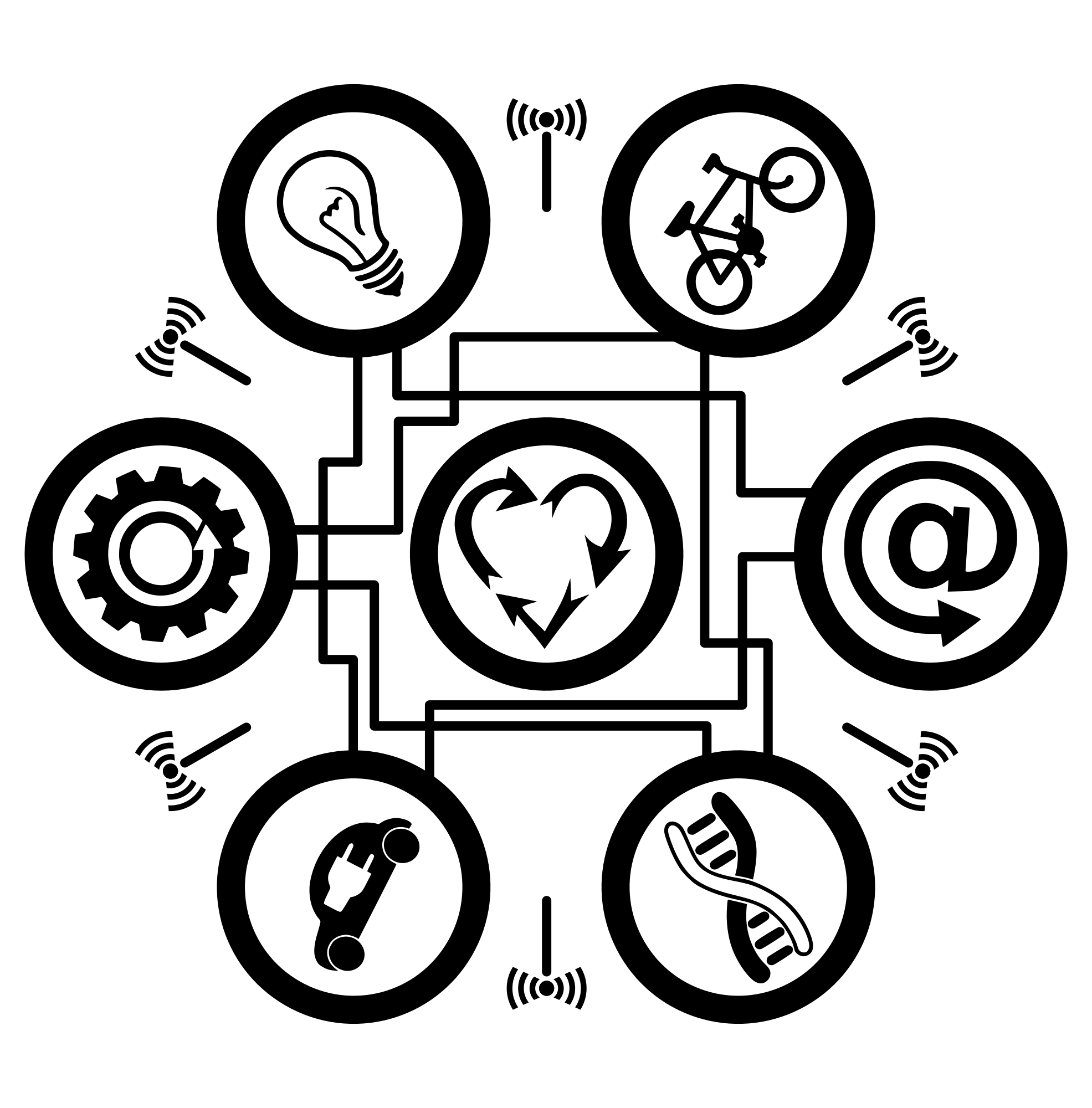 Icons related to iot are connected each other by means of wires or waves : @, the very symbol of modern electronic communication, DNA to store vast amounts of information, a connected car and a device which collect data, a connected light bulb to listen for music, a connected sport. And, in the middle, a symbolized human heart.