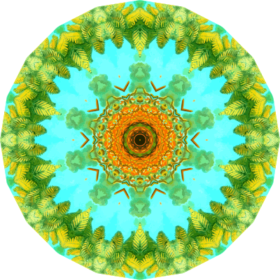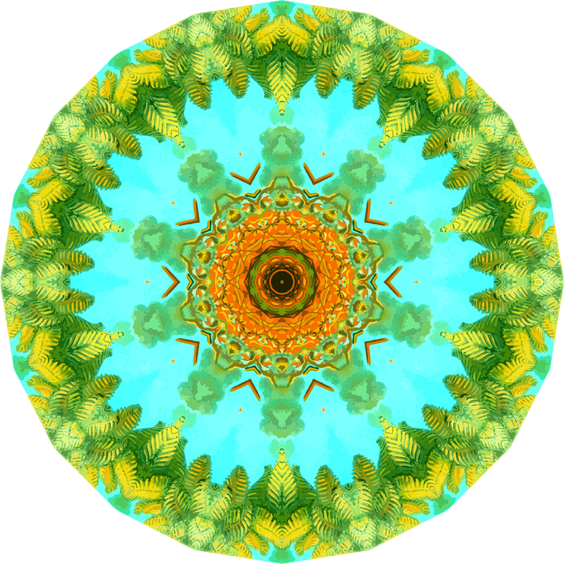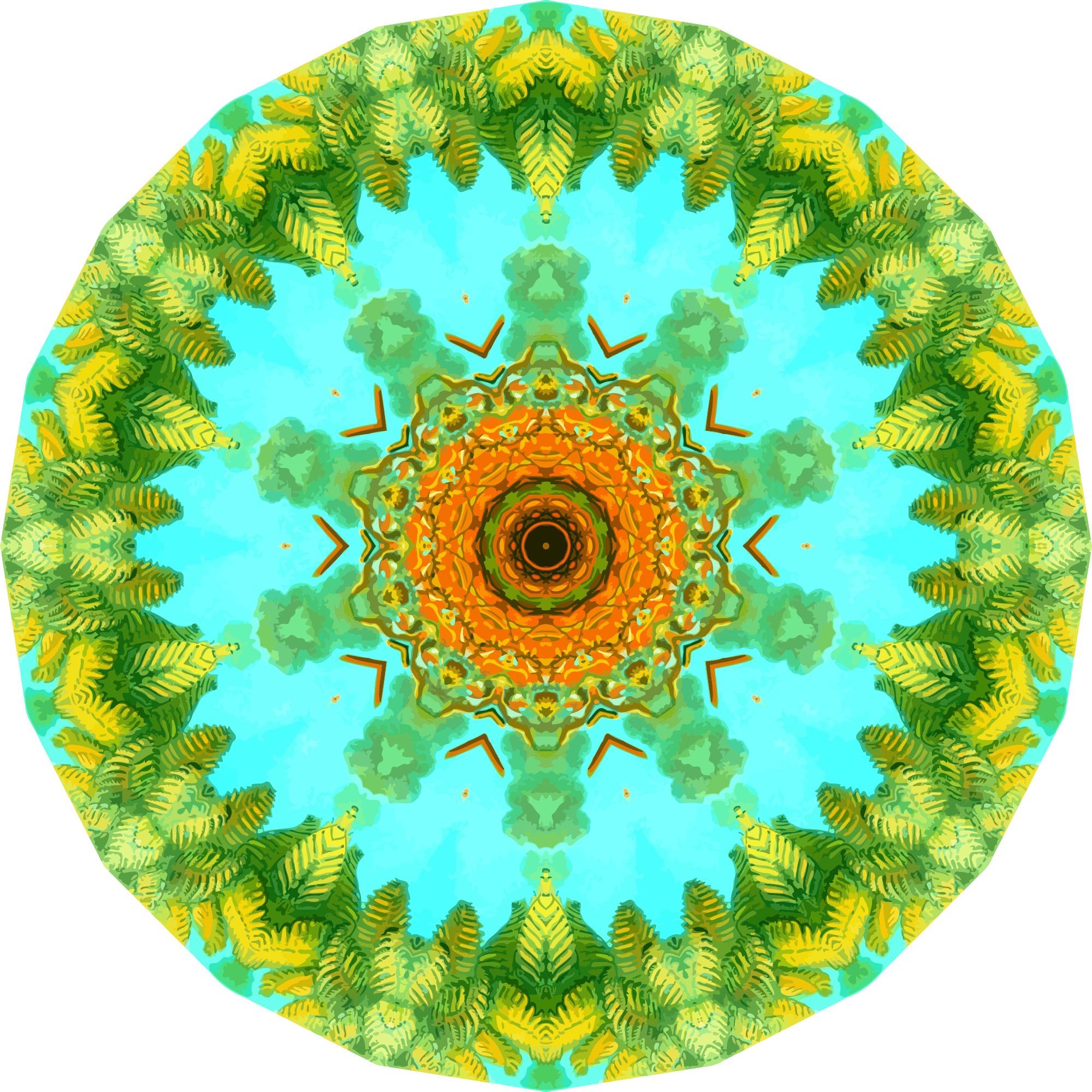 A design with approximate rotational symmetry formed from a drawing of ferns by Ernst Haeckel. The design was drawn as a PNG in Paint.net by repeated rotation of wedges of the drawing around a centre point. It was vectorized in Vector Magic