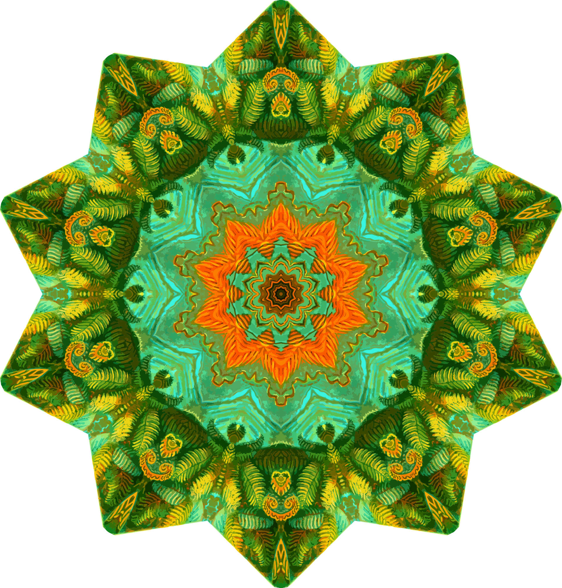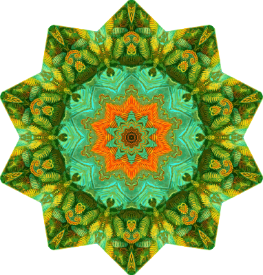 A design with approximate rotational symmetry formed from a drawing of ferns by Ernst Haeckel. The design was drawn as a PNG in Paint.net by repeated rotation of wedges of the drawing around a centre point. It was vectorized in Vector Magic
