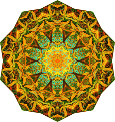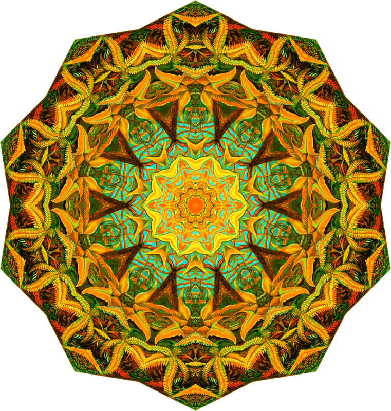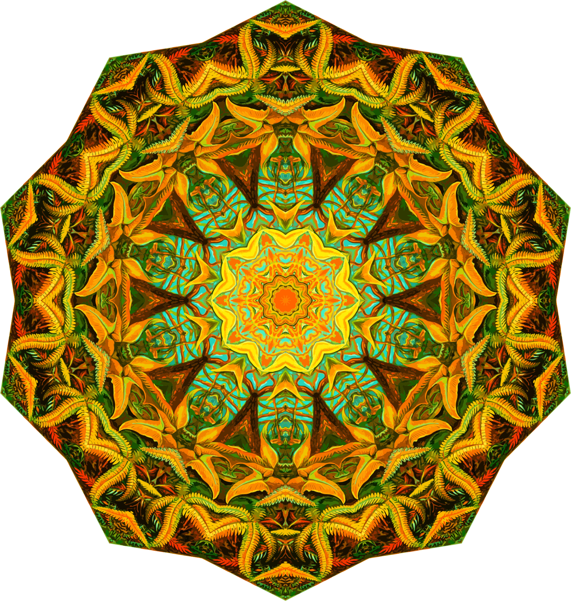 A design with approximate rotational symmetry formed from a drawing of ferns by Ernst Haeckel. The design was drawn as a PNG in Paint.net by repeated rotation of wedges of the drawing around a centre point. It was vectorized in Vector Magic