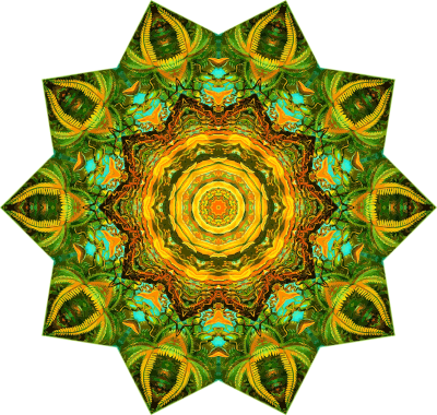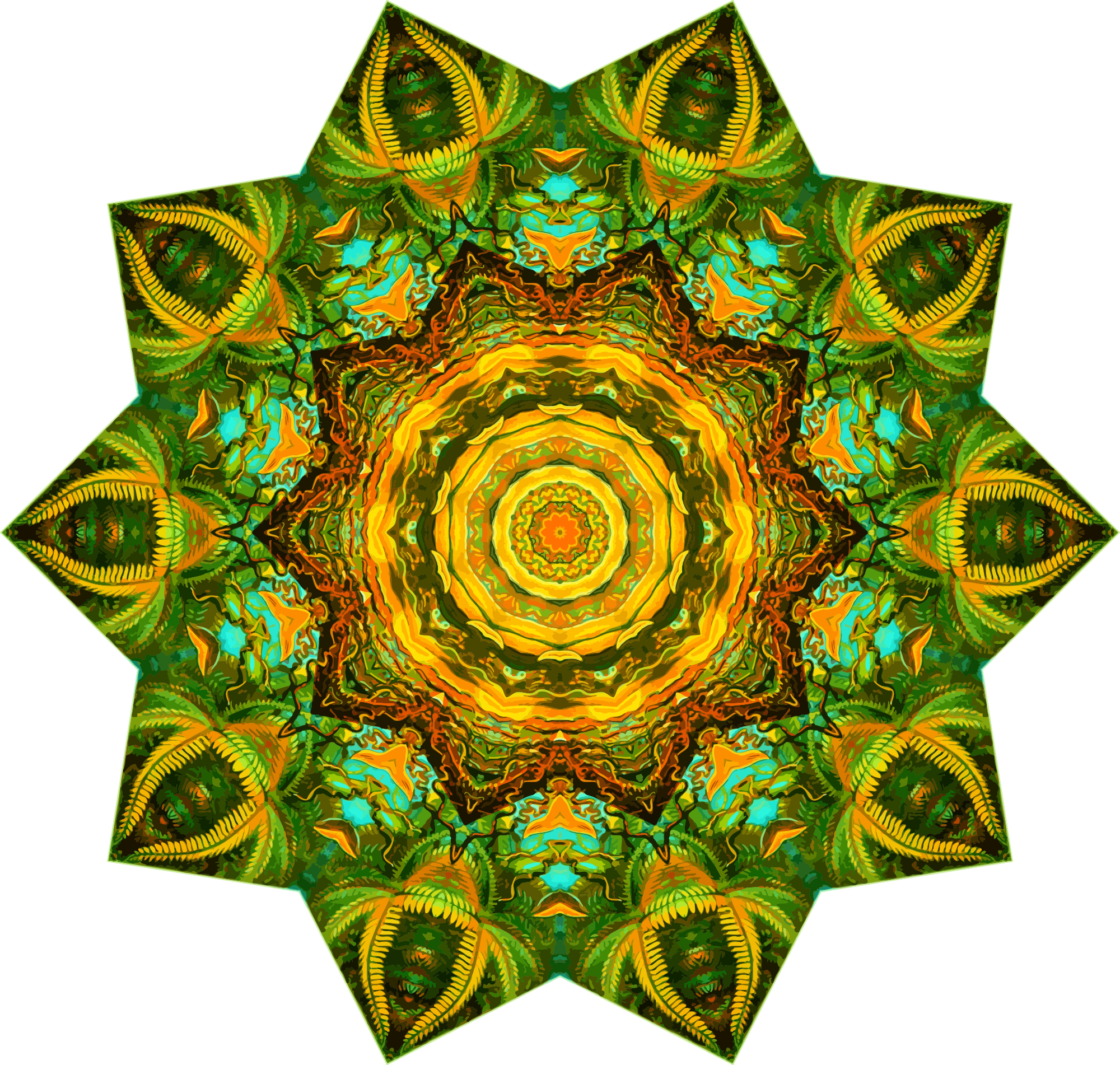 A design with approximate rotational symmetry formed from a drawing of ferns by Ernst Haeckel. The design was drawn as a PNG in Paint.net by repeated rotation of wedges of the drawing around a centre point. It was vectorized in Vector Magic