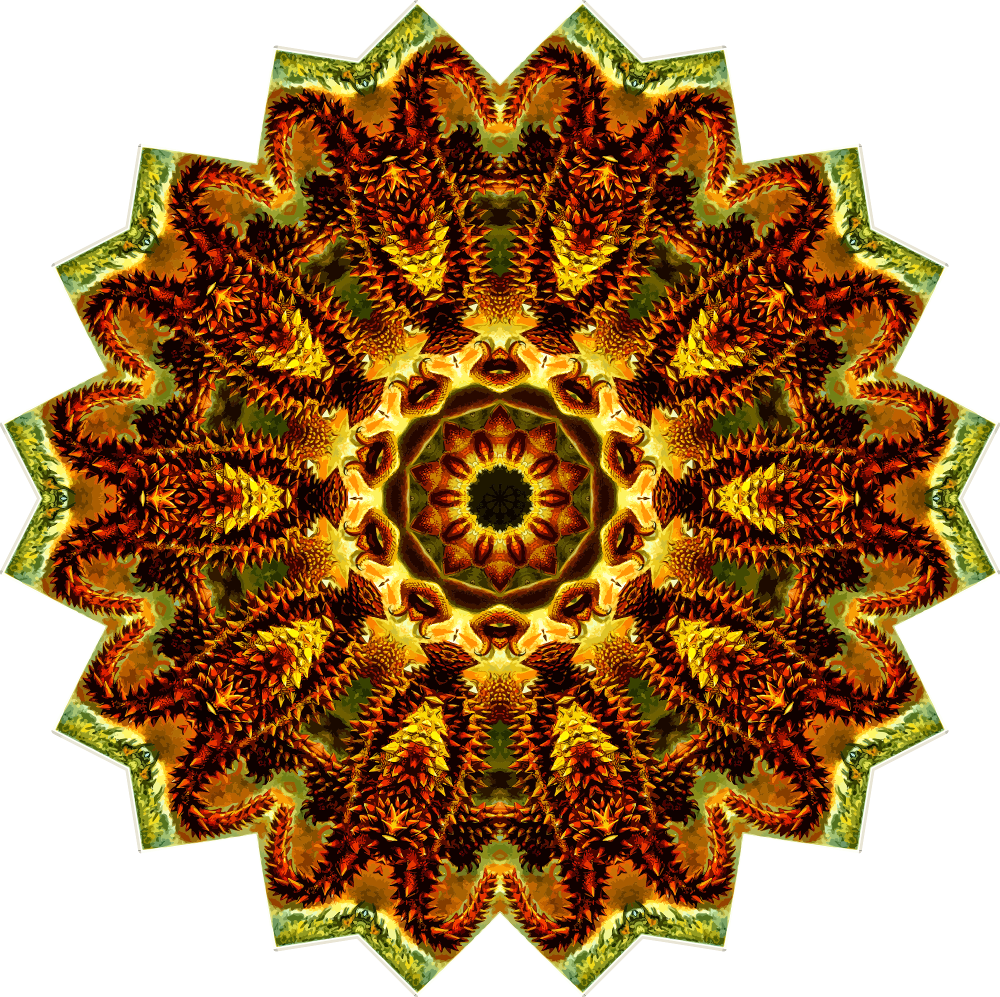 A design with approximate rotational symmetry formed from a drawing of lizards by Ernst Haeckel. The design was drawn as a PNG in Paint.net by repeated rotation of wedges of the drawing around a centre point. It was vectorized in Vector Magic