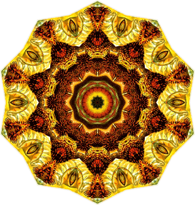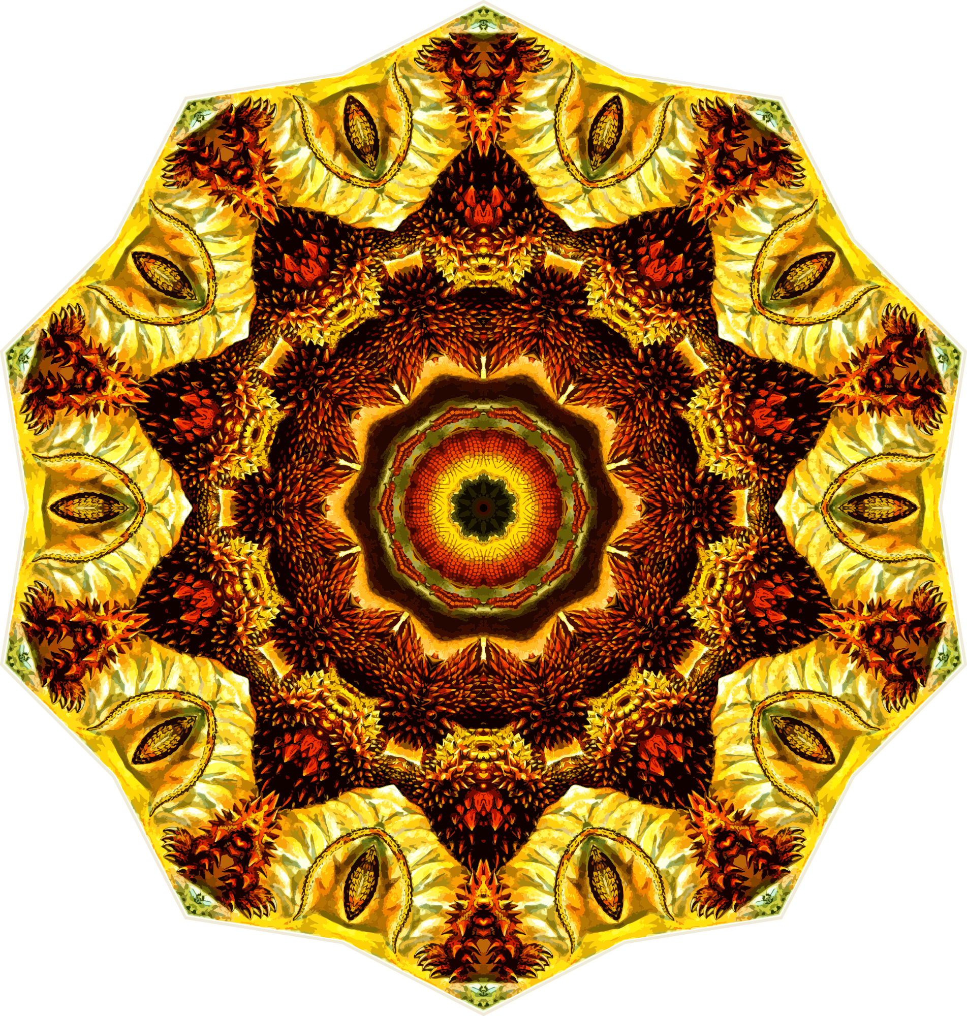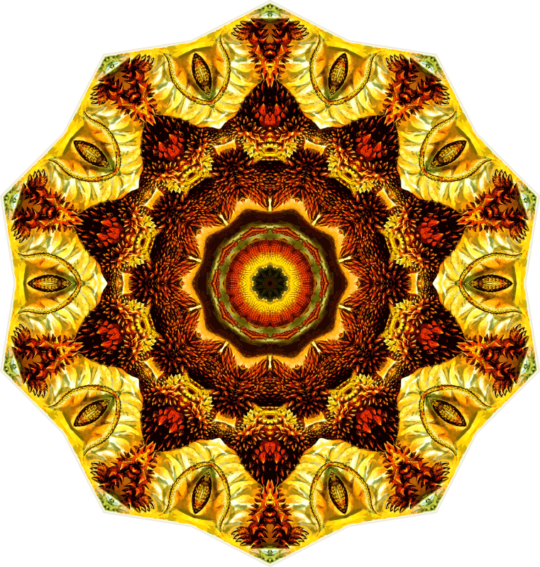 A design with approximate rotational symmetry formed from a drawing of lizards by Ernst Haeckel. The design was drawn as a PNG in Paint.net by repeated rotation of wedges of the drawing around a centre point. It was vectorized in Vector Magic