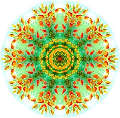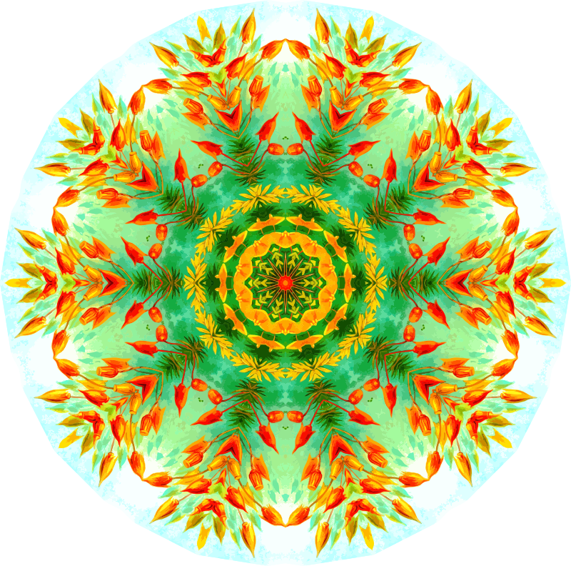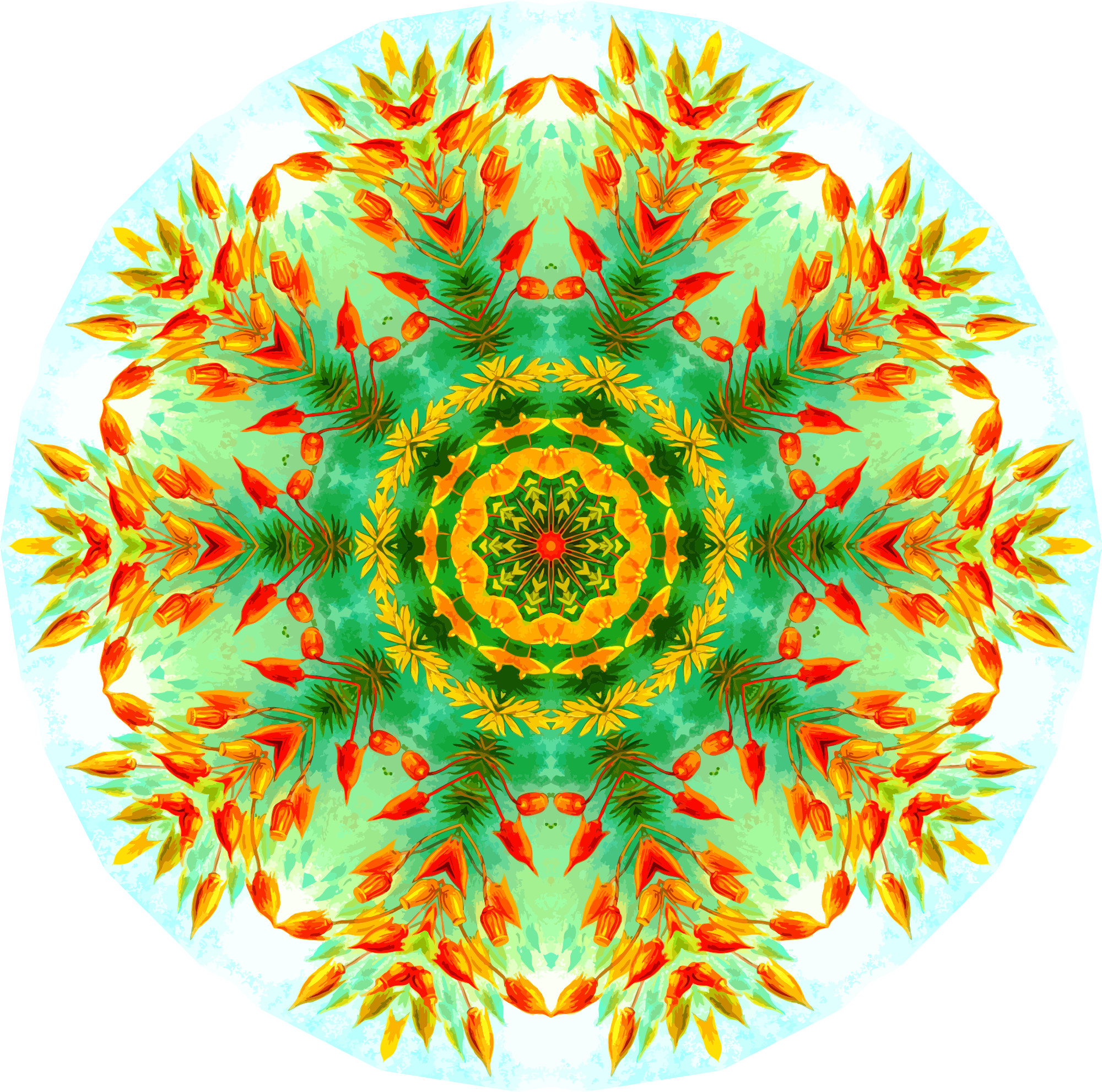 A design with approximate rotational symmetry formed from a drawing of mosses by Ernst Haeckel. The design was drawn as a PNG in Paint.net by repeated rotation of wedges of the drawing around a centre point. It was vectorized in Vector Magic