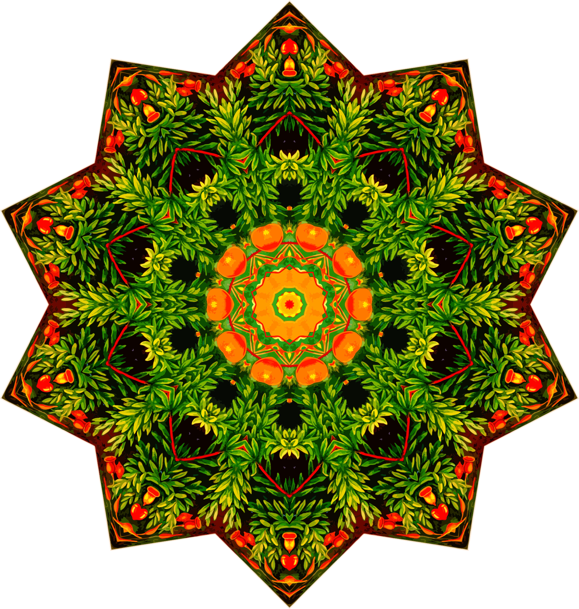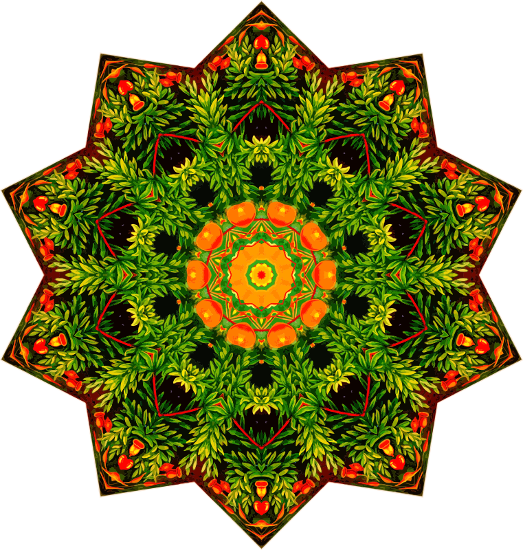 A design with approximate rotational symmetry formed from a drawing of mosses by Ernst Haeckel. The design was drawn as a PNG in Paint.net by repeated rotation of wedges of the drawing around a centre point. It was vectorized in Vector Magic