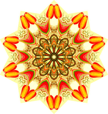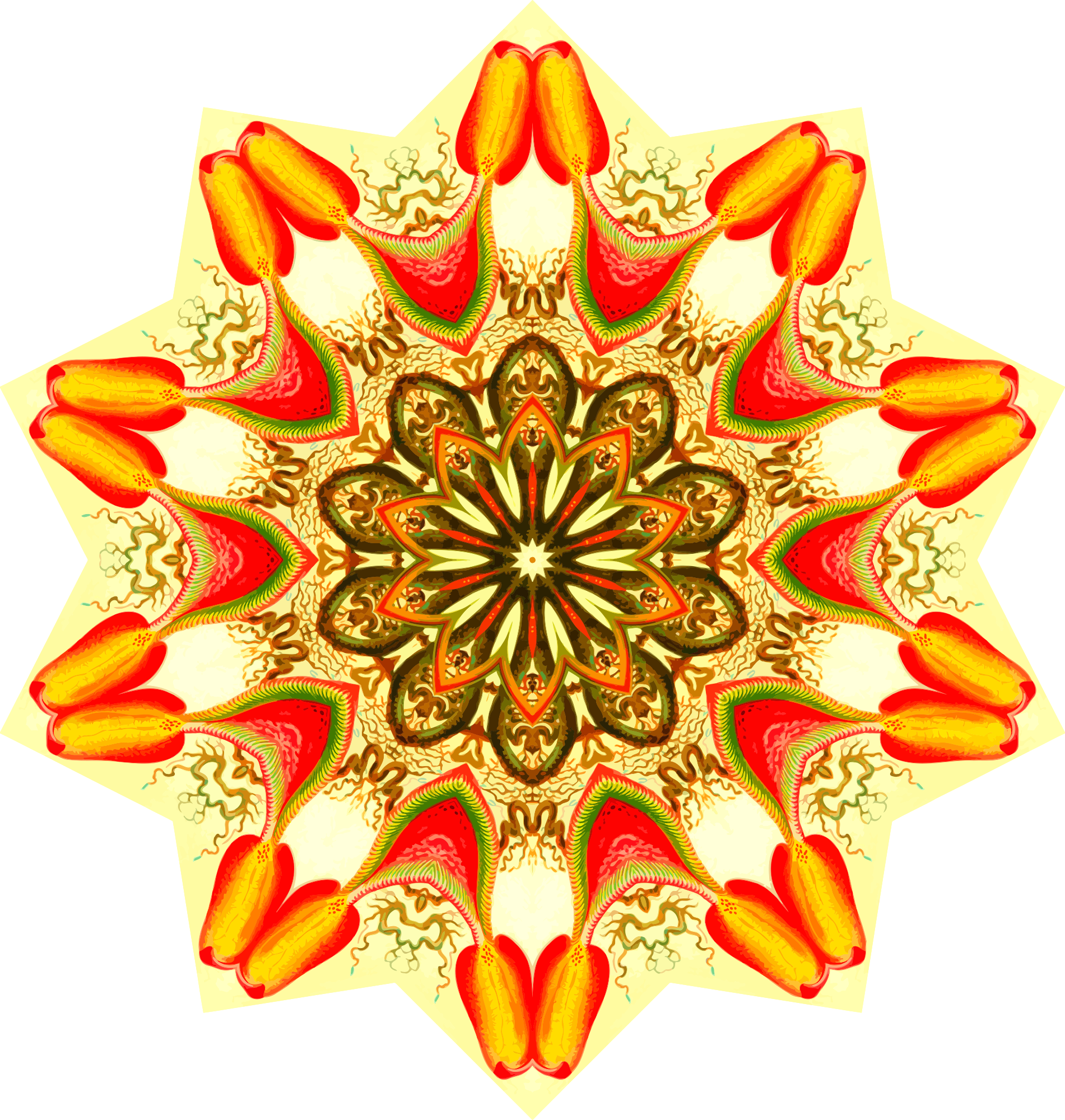 A design with approximate rotational symmetry formed from a drawing of pitcher plants by Ernst Haeckel. The design was drawn as a PNG in Paint.net by repeated rotation of wedges of the drawing around a centre point. It was vectorized in Vector Magic