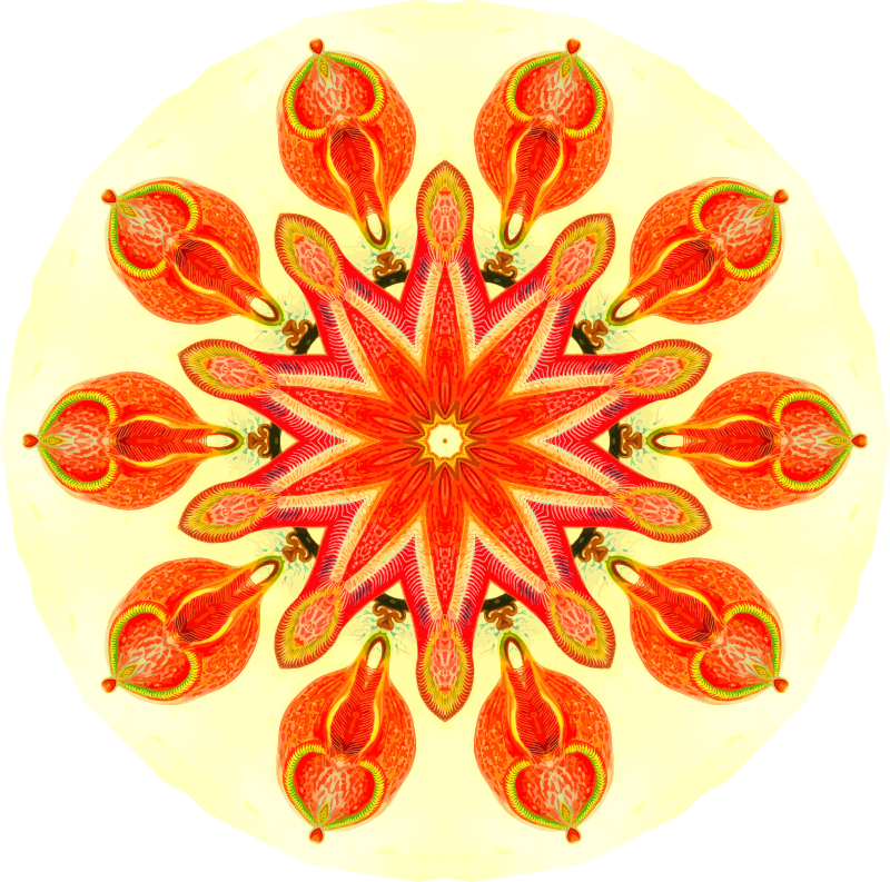 A design with approximate rotational symmetry formed from a drawing of pitcher plants by Ernst Haeckel. The design was drawn as a PNG in Paint.net by repeated rotation of wedges of the drawing around a centre point. It was vectorized in Vector Magic