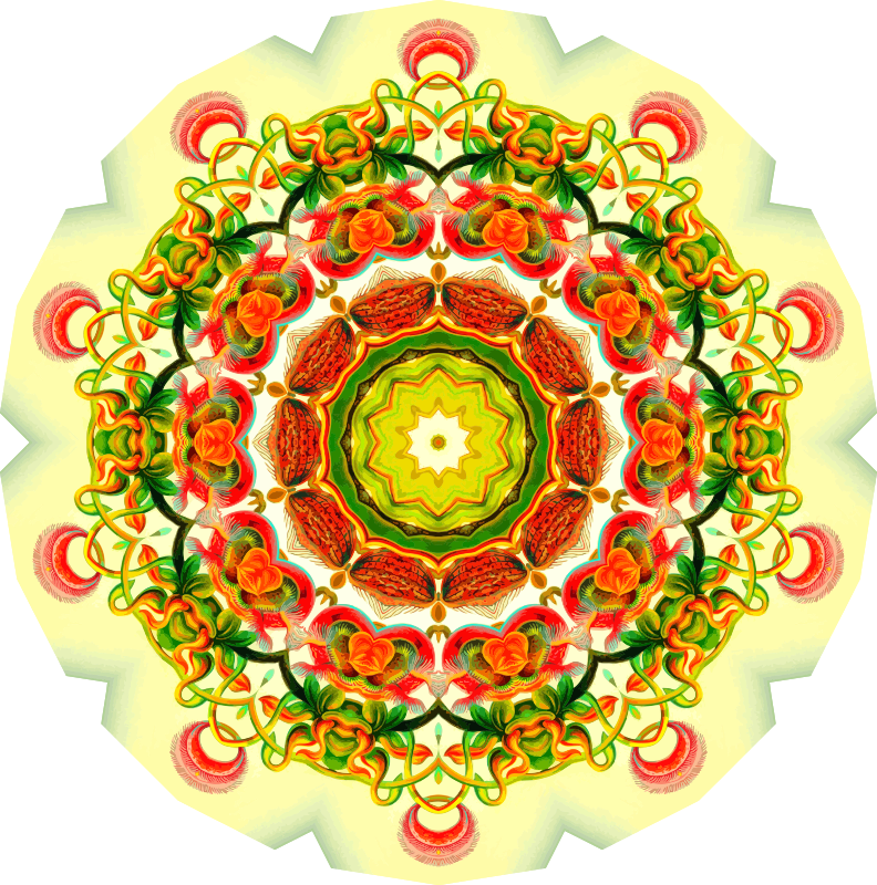 A design with approximate rotational symmetry formed from a drawing of pitcher plants by Ernst Haeckel. The design was drawn as a PNG in Paint.net by repeated rotation of wedges of the drawing around a centre point. It was vectorized in Vector Magic