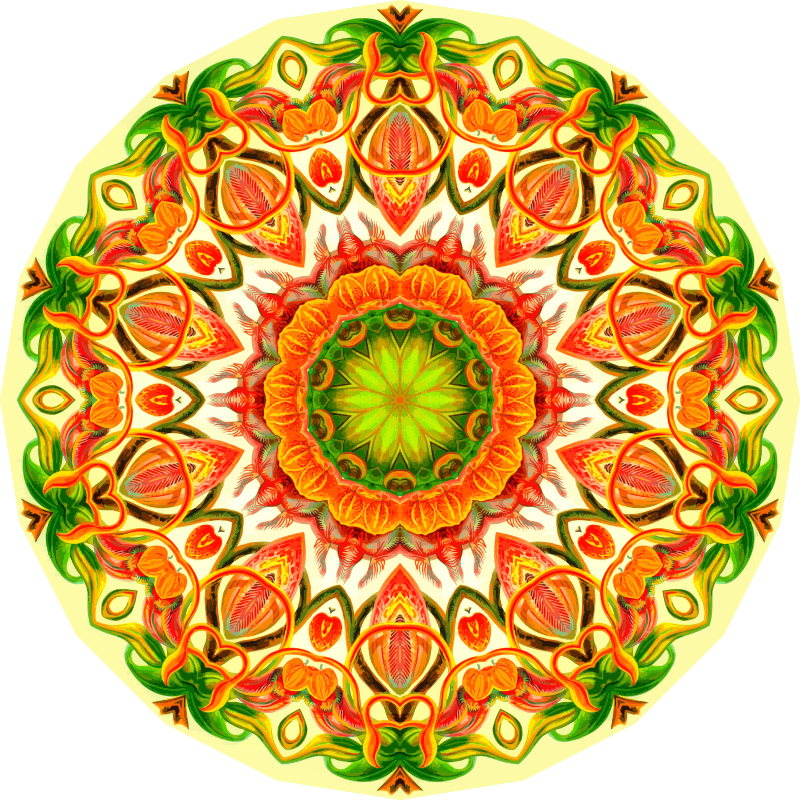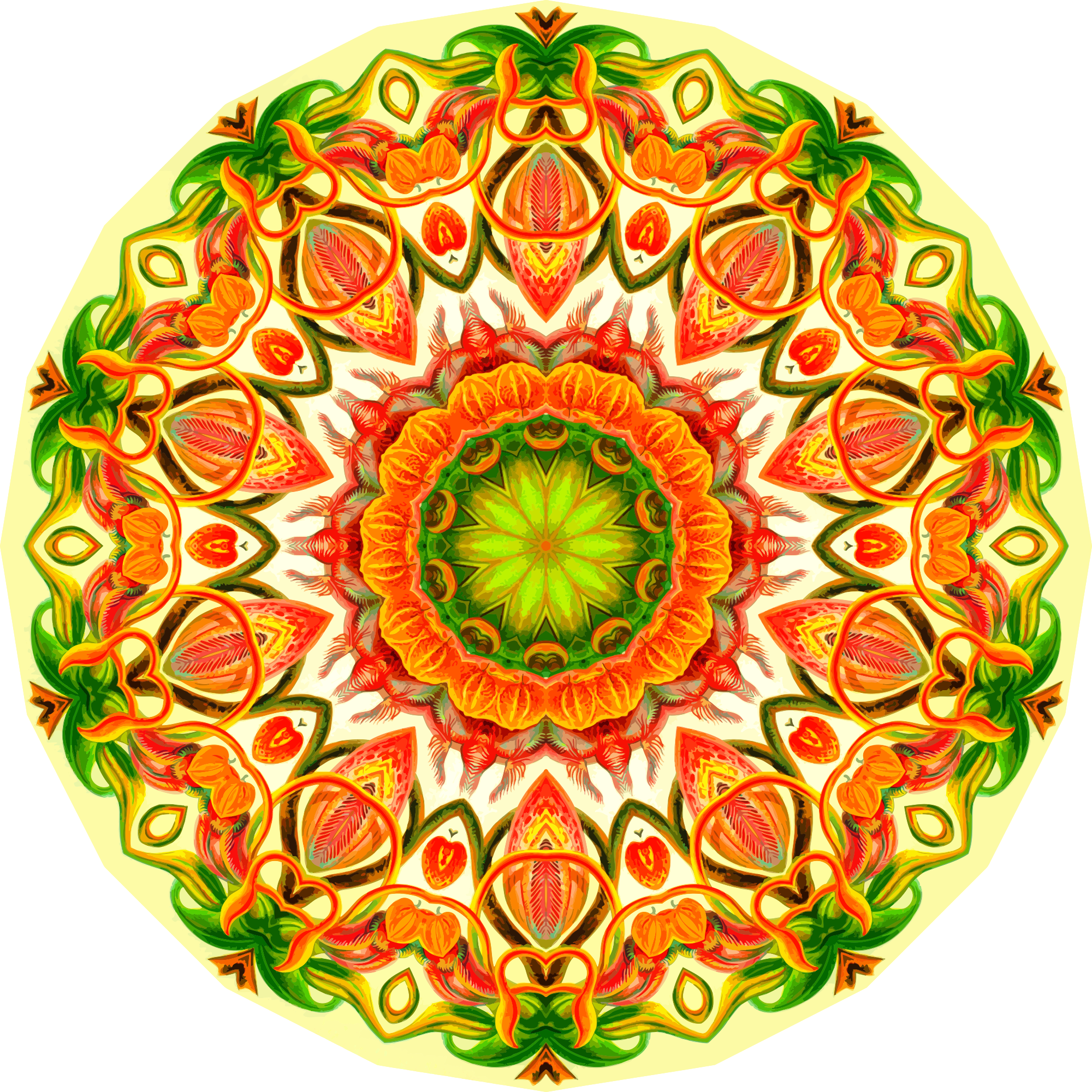 A design with approximate rotational symmetry formed from a drawing of pitcher plants by Ernst Haeckel. The design was drawn as a PNG in Paint.net by repeated rotation of wedges of the drawing around a centre point. It was vectorized in Vector Magic